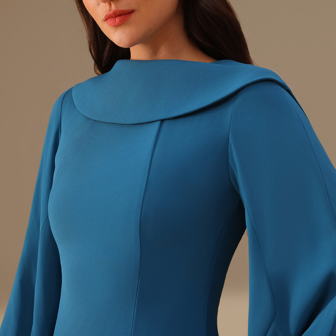 فستان ميدي كتان مخلوط بياقة عريضة مطوية