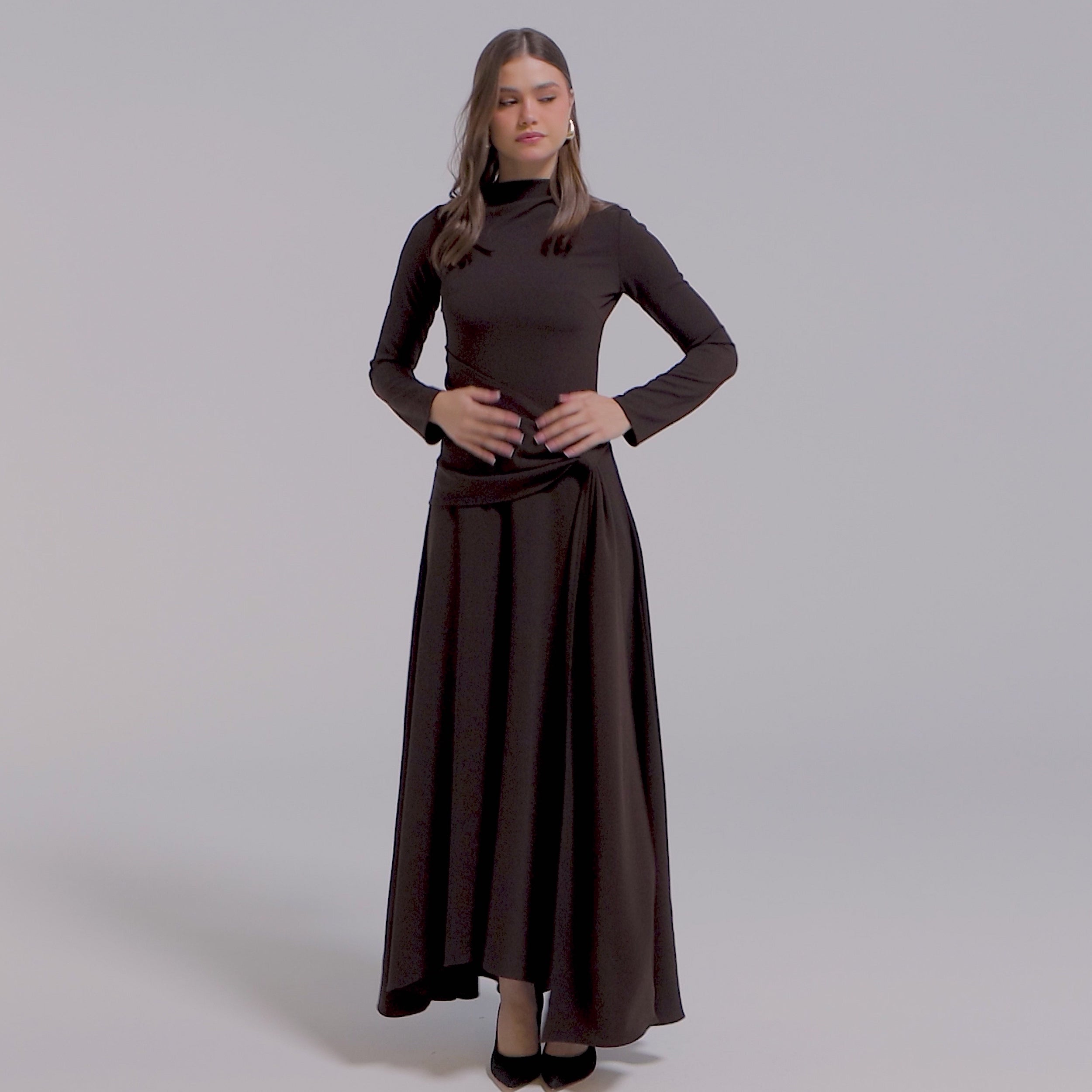 فستان بني غامق ماكسي كريب مزموم برقبة مائلة