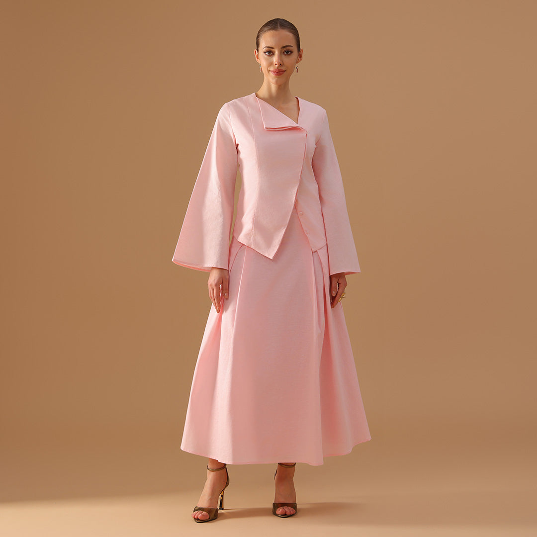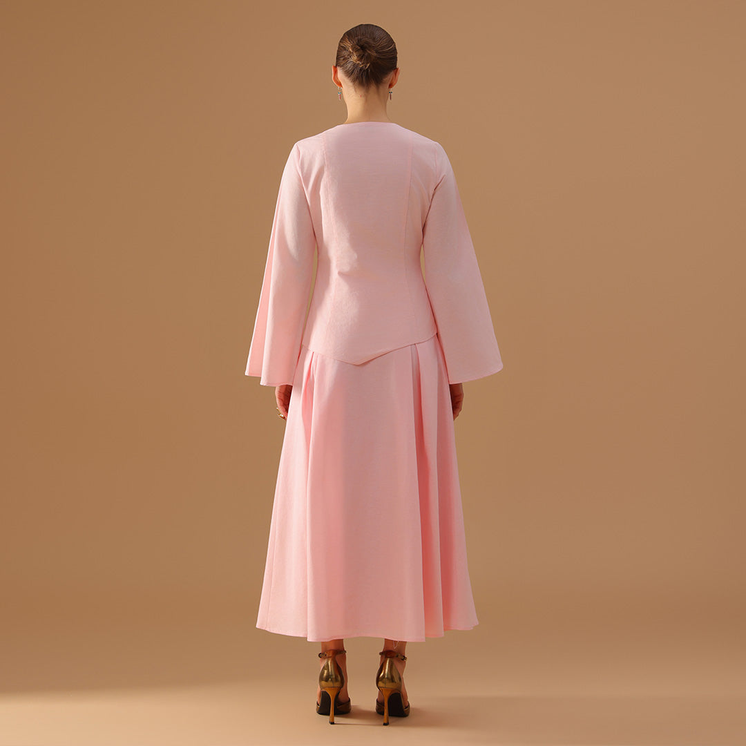 طقم وردي كتان مخلوط بأكمام طويلة - توب وتنورة