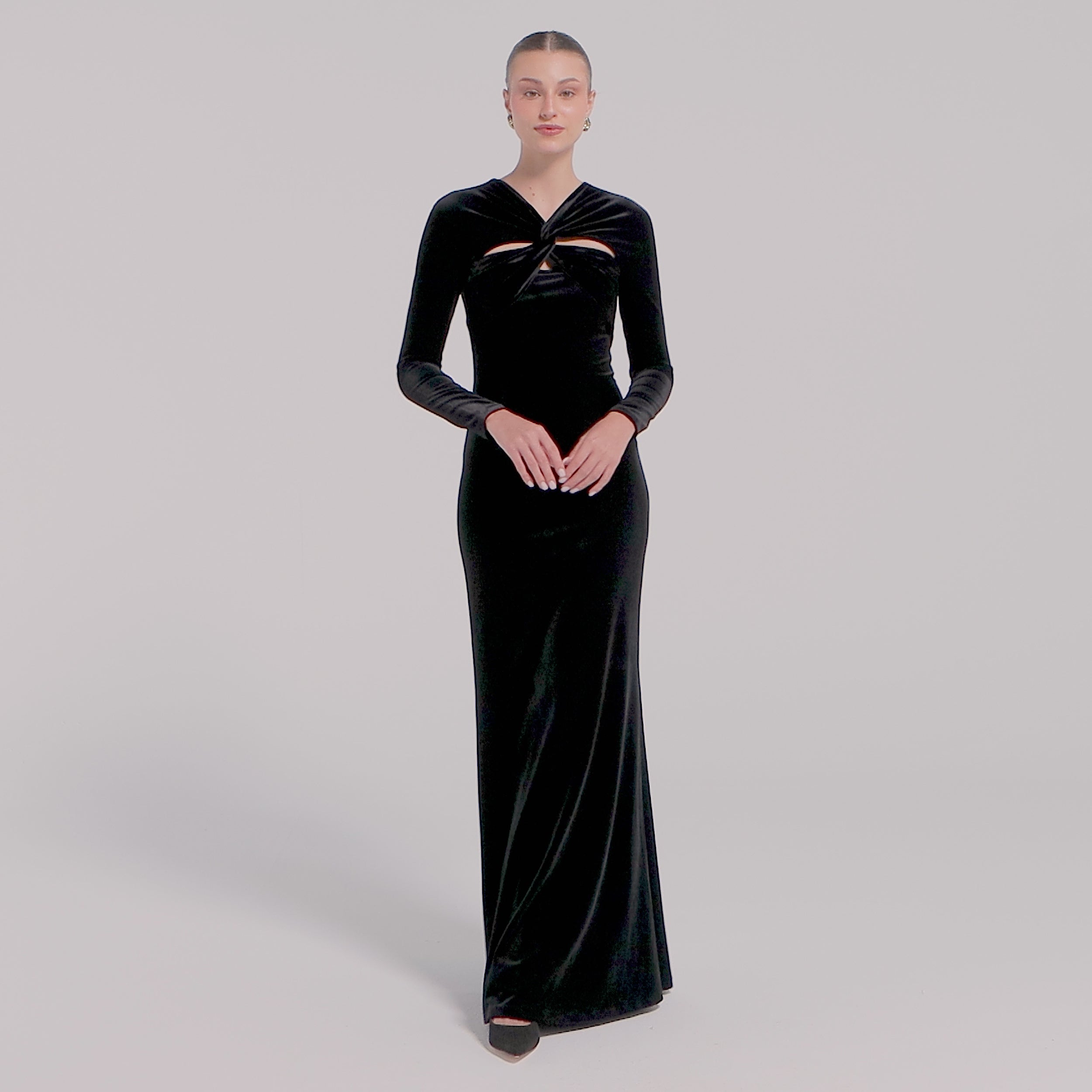 فستان أسود ماكسي مخمل بفتحات على الصدر