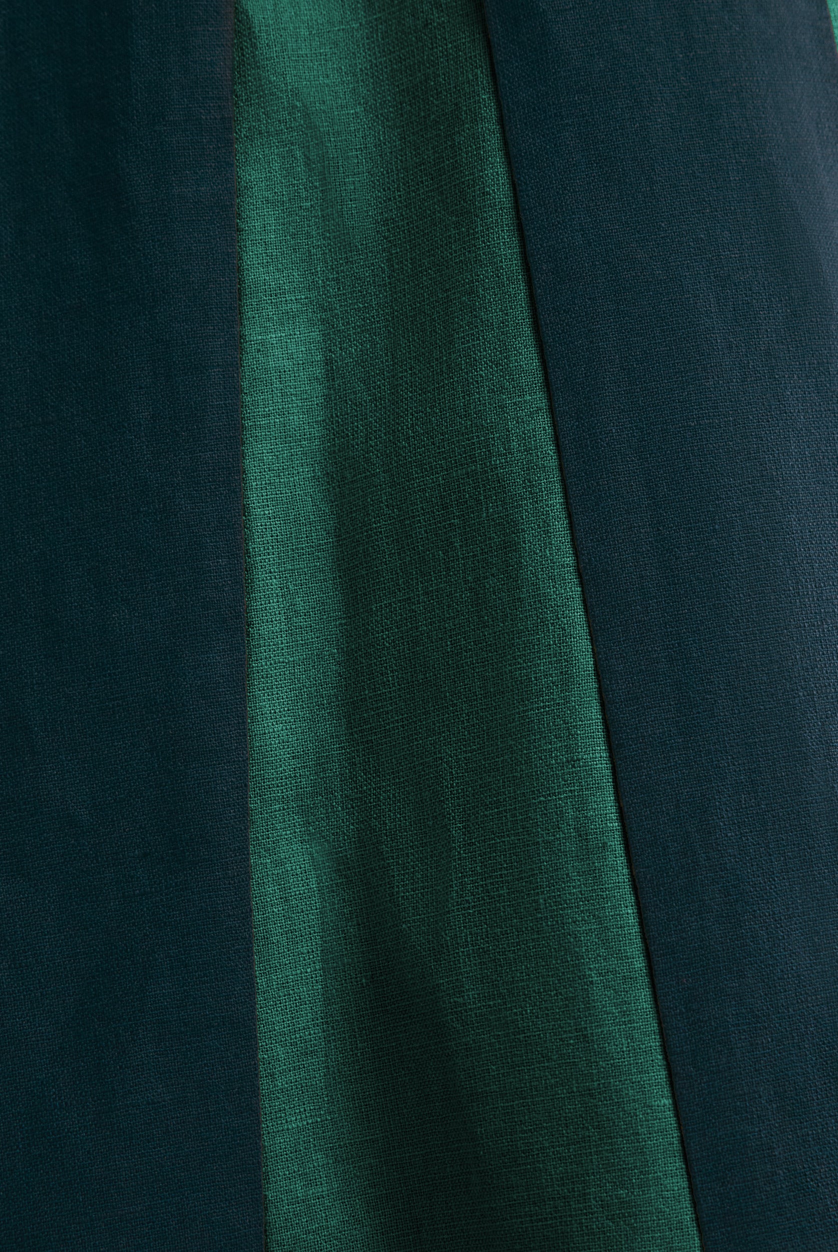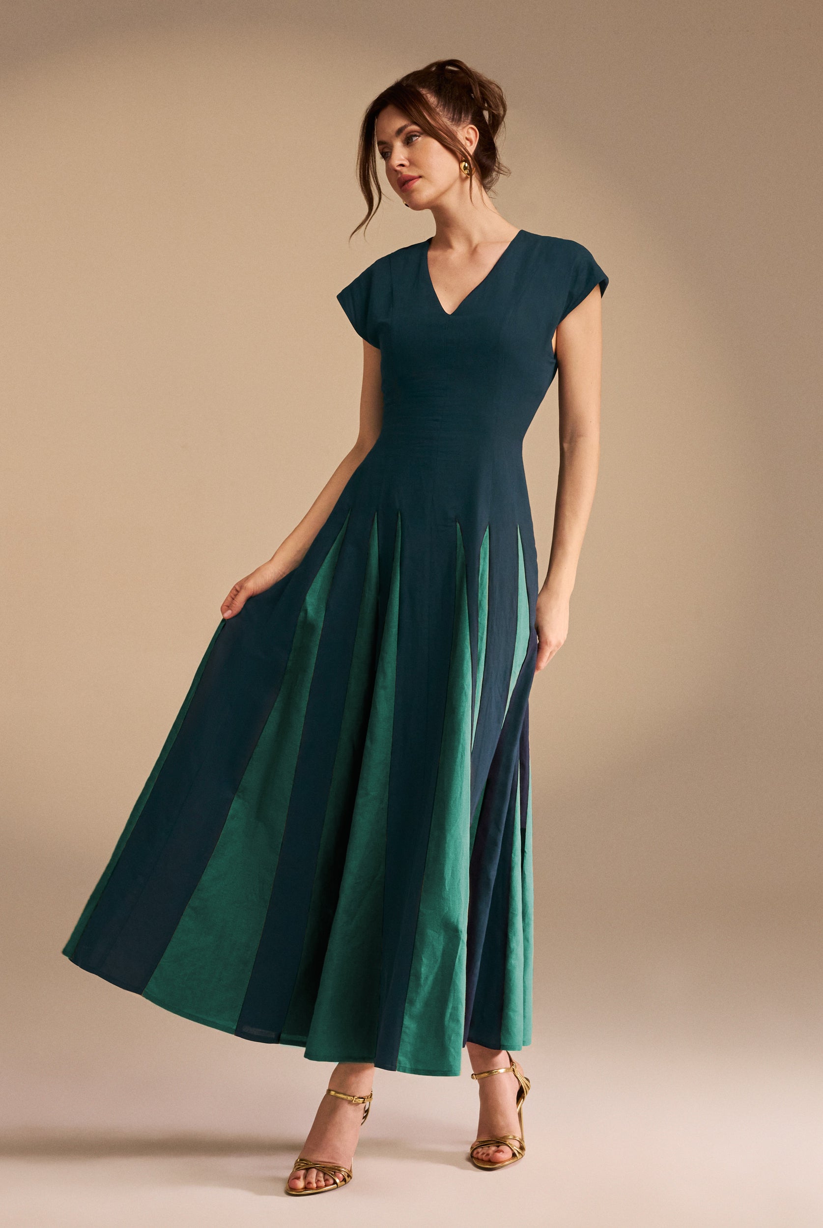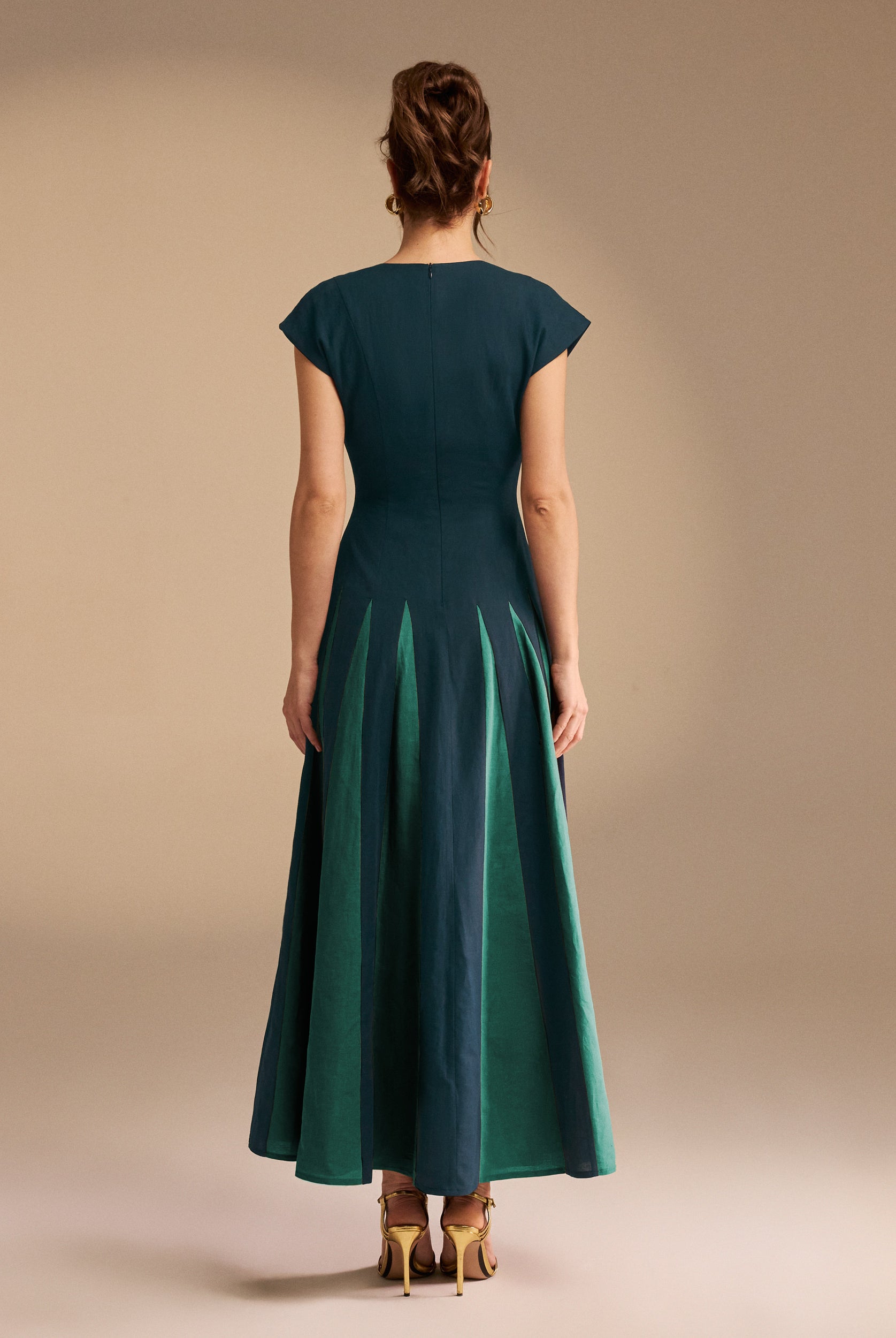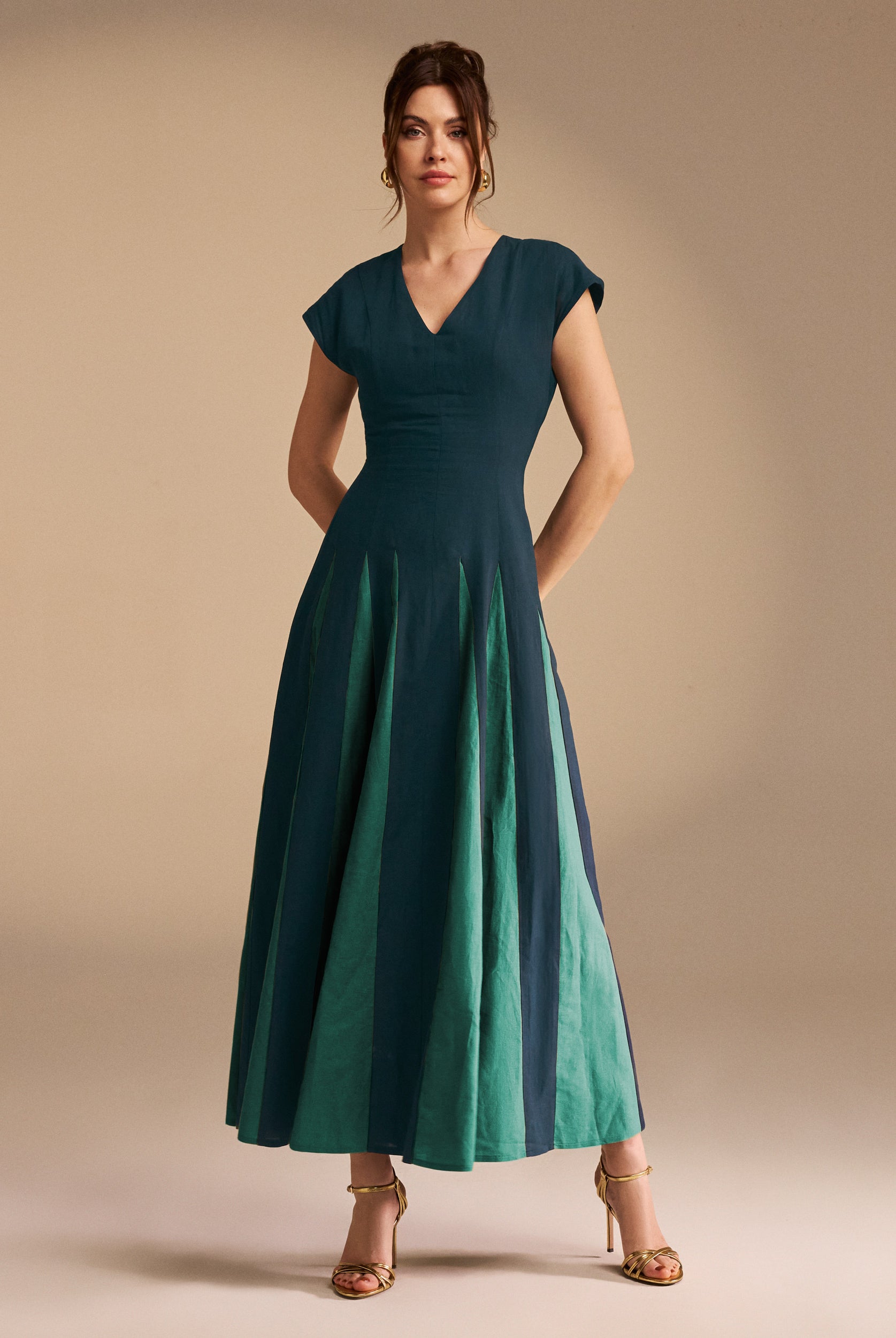 فستان اخضرمن الكتان ذو أكمام كاب ناعمة