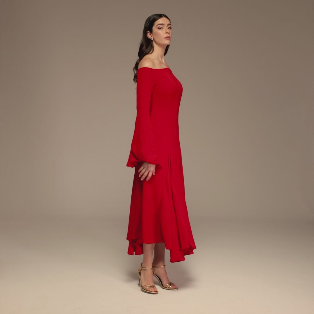 فستان ميدي مكشوف الكتف من قماش الكريب الناعم، يتميز بتنورة A تنسدل بانسيابية خفيفة. تتسع الأكمام الطويلة عند الأطراف مع إدخالات جوديه تضيف حركة ولمسة درامية ناعمة. يزين الصدر صف من الأزرار المغطاة بالقماش تمنح الفستان طابعًا كلاسيكيًا راقيًًا. هذا الفستان هو قطعة أنيقة وسهلة الارتداء في آنٍ واحد.