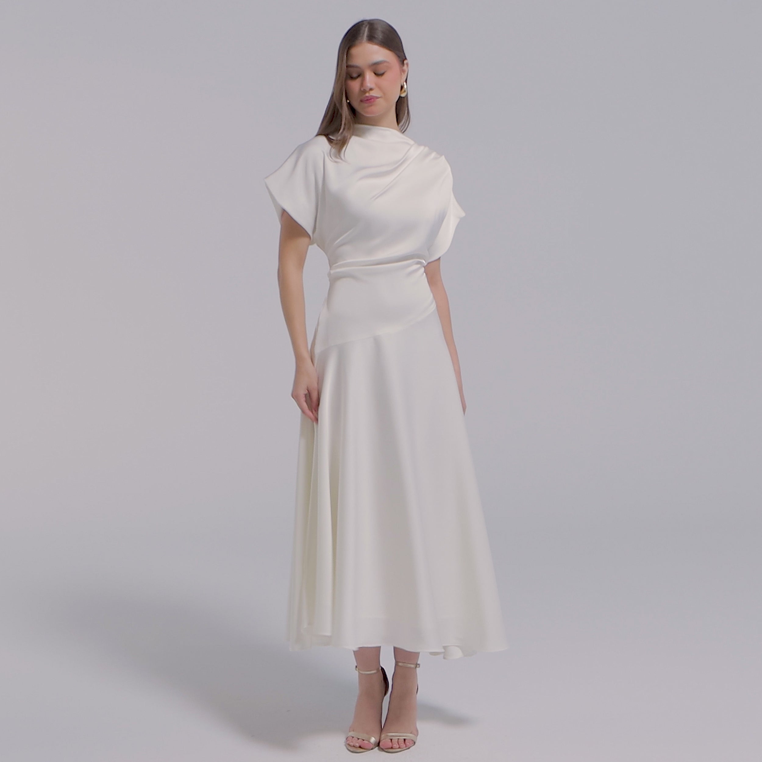 فستان ساتان غير متماثل بأكمام قصيرة من مجموعة صيف 2025. يتميّز بثنيات ناعمة عند الكتف، وحاشية غير متماثلة تنسدل بانسيابية بحركة راقية في كل خطوة.