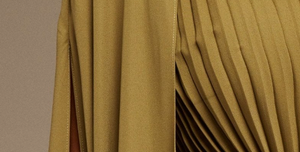 فستان شيفون بليسيه بقصة A، يتميز بأكمام كاب بفتحات تمتد إلى وشاحين في الخلف ينسدلان من ياقة عالية. يوفر التصميم حرية في الحركة، لكن إلى جانب كونه مريح، فهو غني بتفاصيل أنيقة كفيلة بجعلك محط أنظار الجميع.