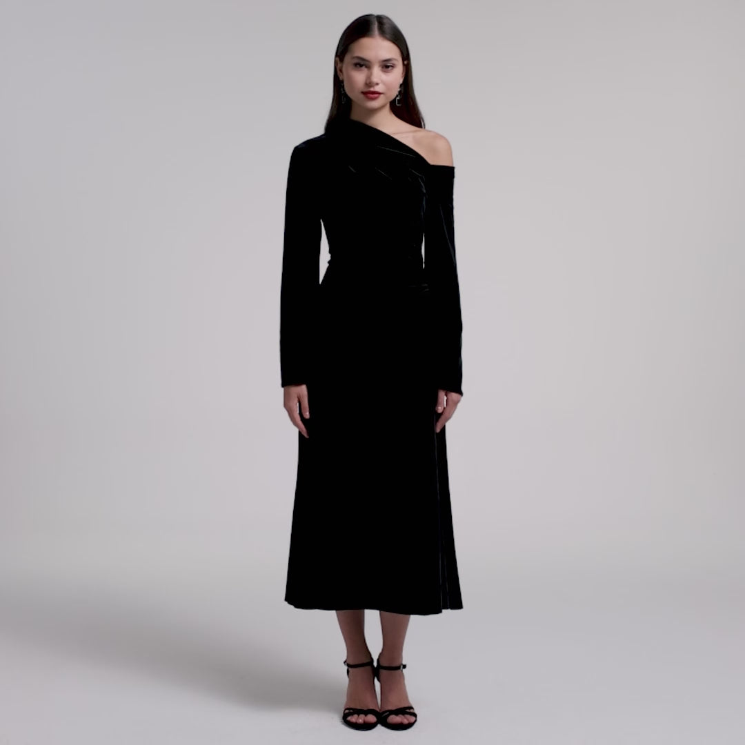 فستان ميدي مخمل بياقة درابيه تنسدل على كتف واحد مكشوف، بتصميم يجمع بين الأناقة والطابع العصري. الخصر المحدد يبرز القوام، فيما تمنح التنورة الواسعة إطلالة مريحة وحركة انسيابية، ليكون خيارًا مناسبًا للعشاءات الرسمية أو الأمسيات الخاصة.