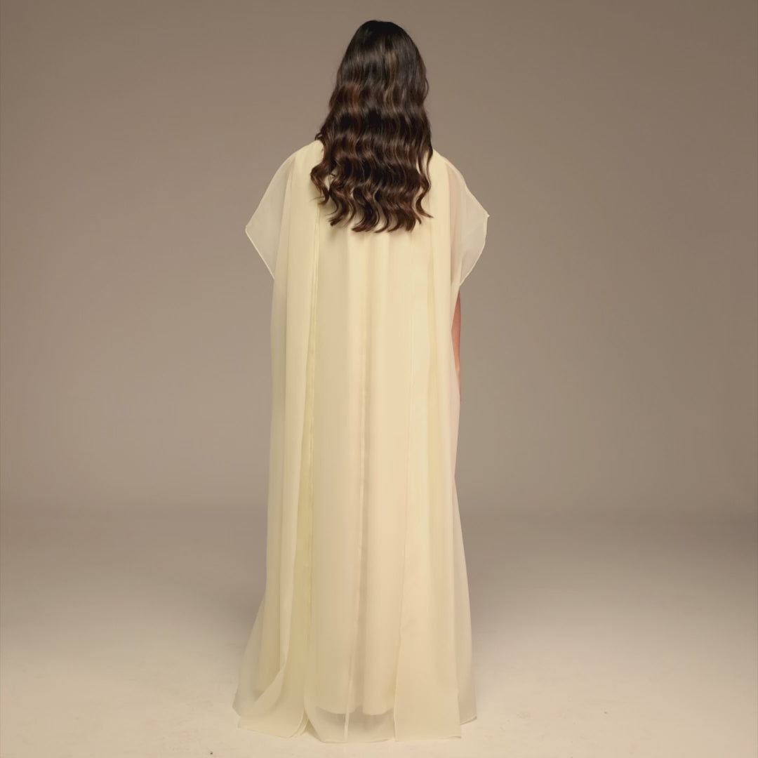 فستان ماكسي بياقة عالية يجمع بين البساطة والنعومة. القطعة الداخلية من الكريب مبطنة بالكامل وتأتي بقصة A مريحة تغطي الجسم بانسيابية، بينما ينسدل الكاب الشيفون الخفيف فوق الأكتاف بنعومة، ويكتمل بتفصيلة سكارف من الخلف تضيف لمسة أناقة ناعمة بلا تكلف.