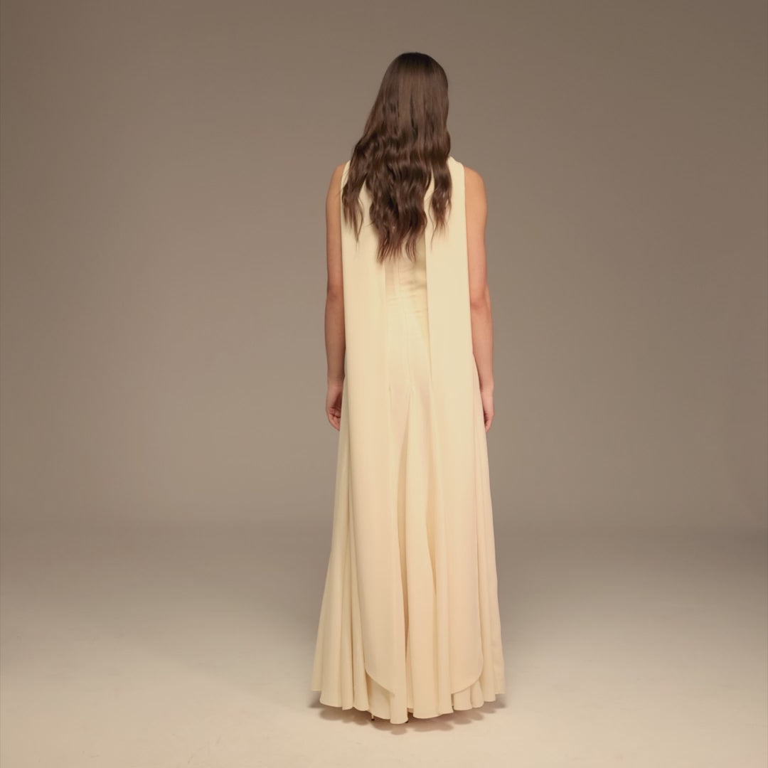 فستان طويل شيفون يتميز بصدر بثنيات وقصة على شكل قلب تبرز منطقة العنق بأسلوب راقي وغير مكشوف. الأكمام القصيرة المزمومة والخصر المنخفض المزموم يضيفان تحديدًا ناعمًا للقوام دون ضيق، فيما تنورة A الواسعة تنسدل بانسيابية أنيقة. قطعة أنيقة وسهلة في نفس الوقت.