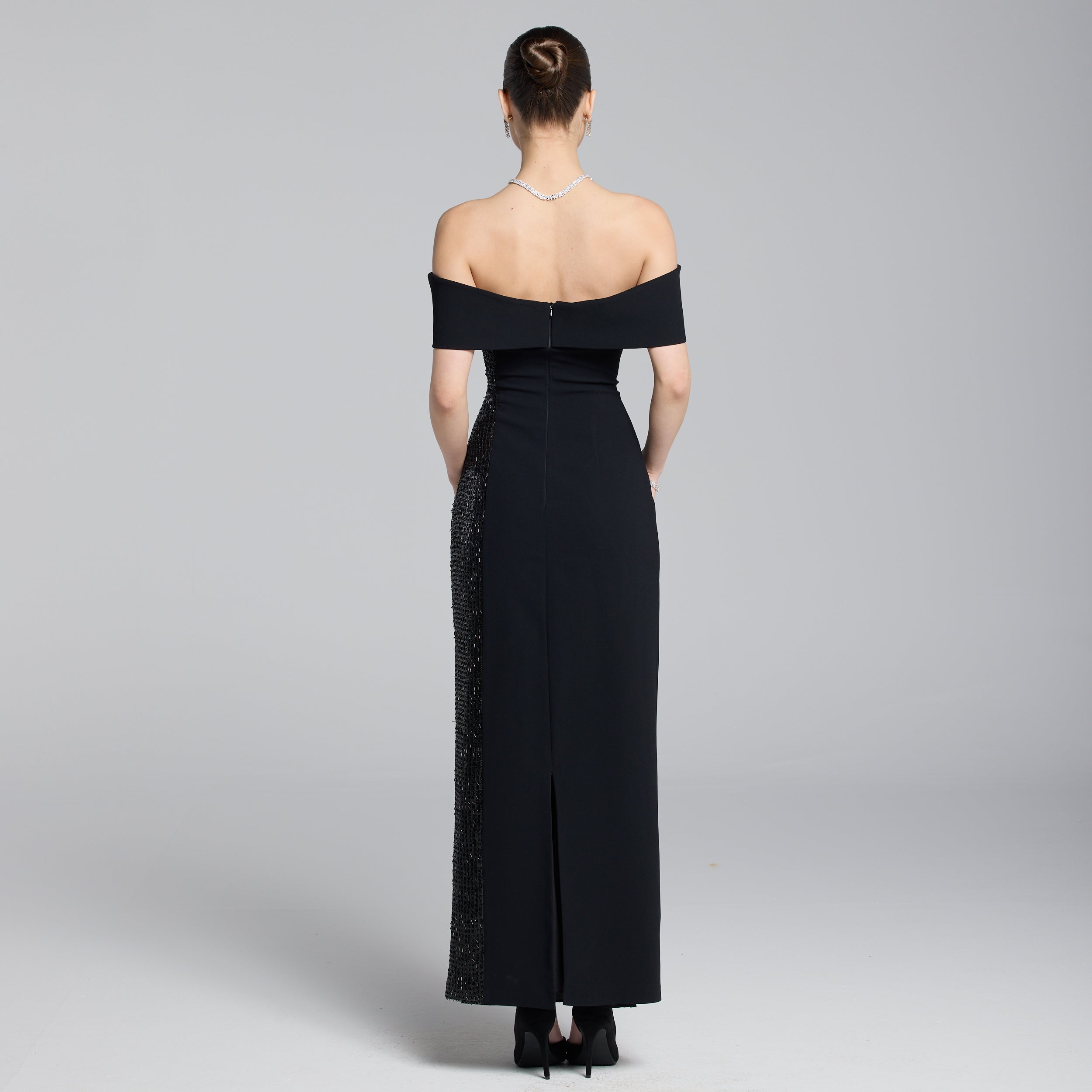 فستان كريب أسود ماكسي بكتف مكشوف وفتحة خلفية