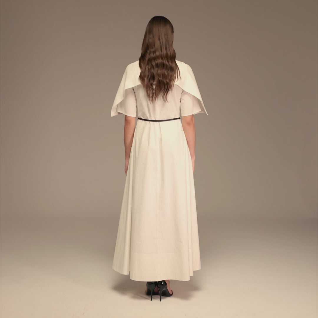 فستان ميدي من قماش بوبلين أبيض، يتميز بياقة وأكمام بتفصيل مطوية تضيف بُعدًا ناعمًا للتصميم من دون أن يبدو حادًا. يضفي الحزام الأسود تباينًا بسيطًا، بينما تمنح الحافة العريضة حركة خفيفة أثناء المشي. إنه قطعة يمكنك ارتداؤها من الصباح إلى المساء بلا مجهود!