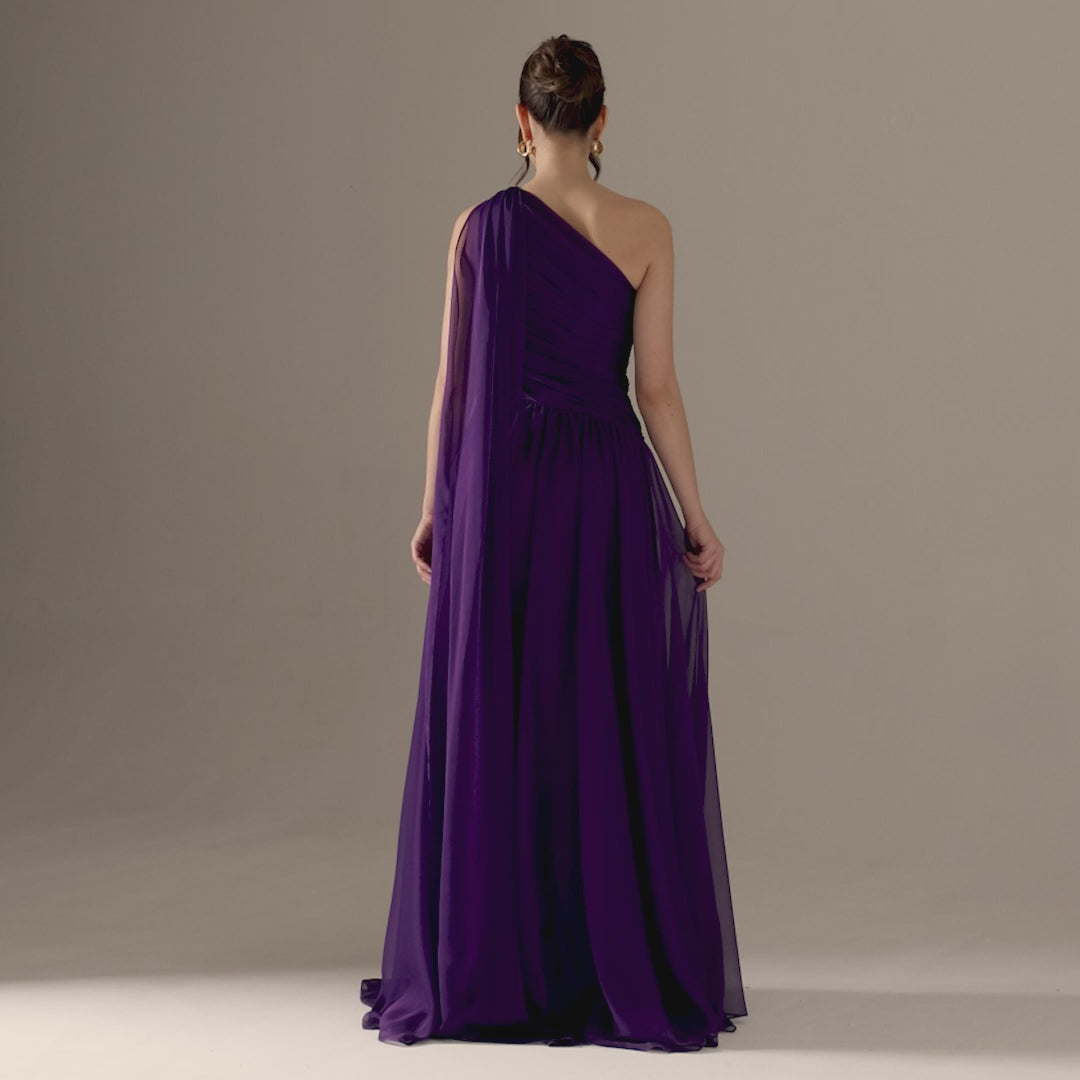 استمتعي بالأناقة مع فستاننا الطويل ذو الكتف الواحد. يتميز هذا الفستان المصنوع من الشيفون الشفاف بالسحر والرقي. يضيف التصميم المنسدل والصورة الظلية ذات الكتف الواحد لمسة من السحر الجذاب. ارتقي بأي مناسبة مع هذا الفستان المذهل.
