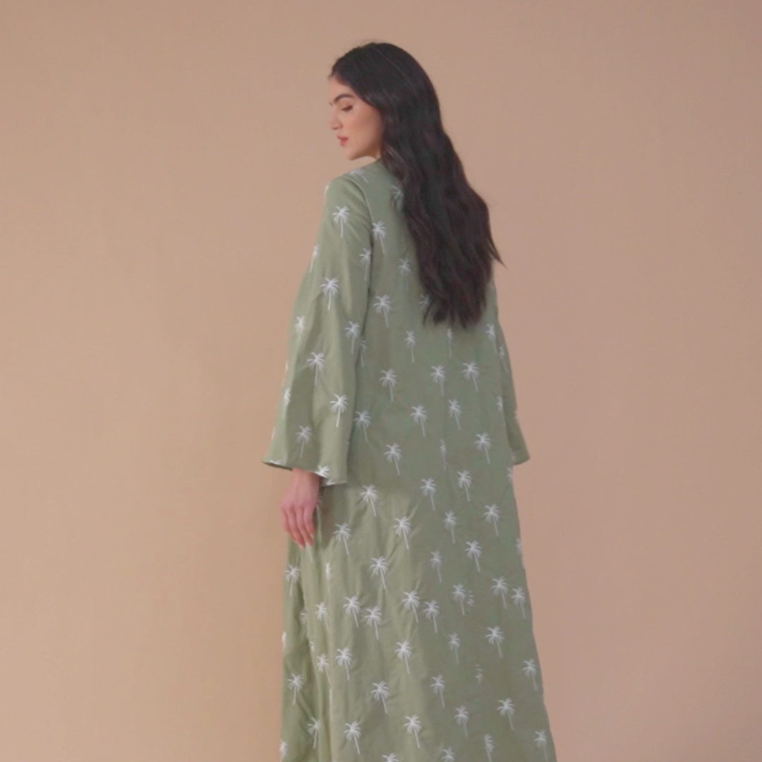 قفطان أخضر مزخرف بالكامل بأكمام طويلة