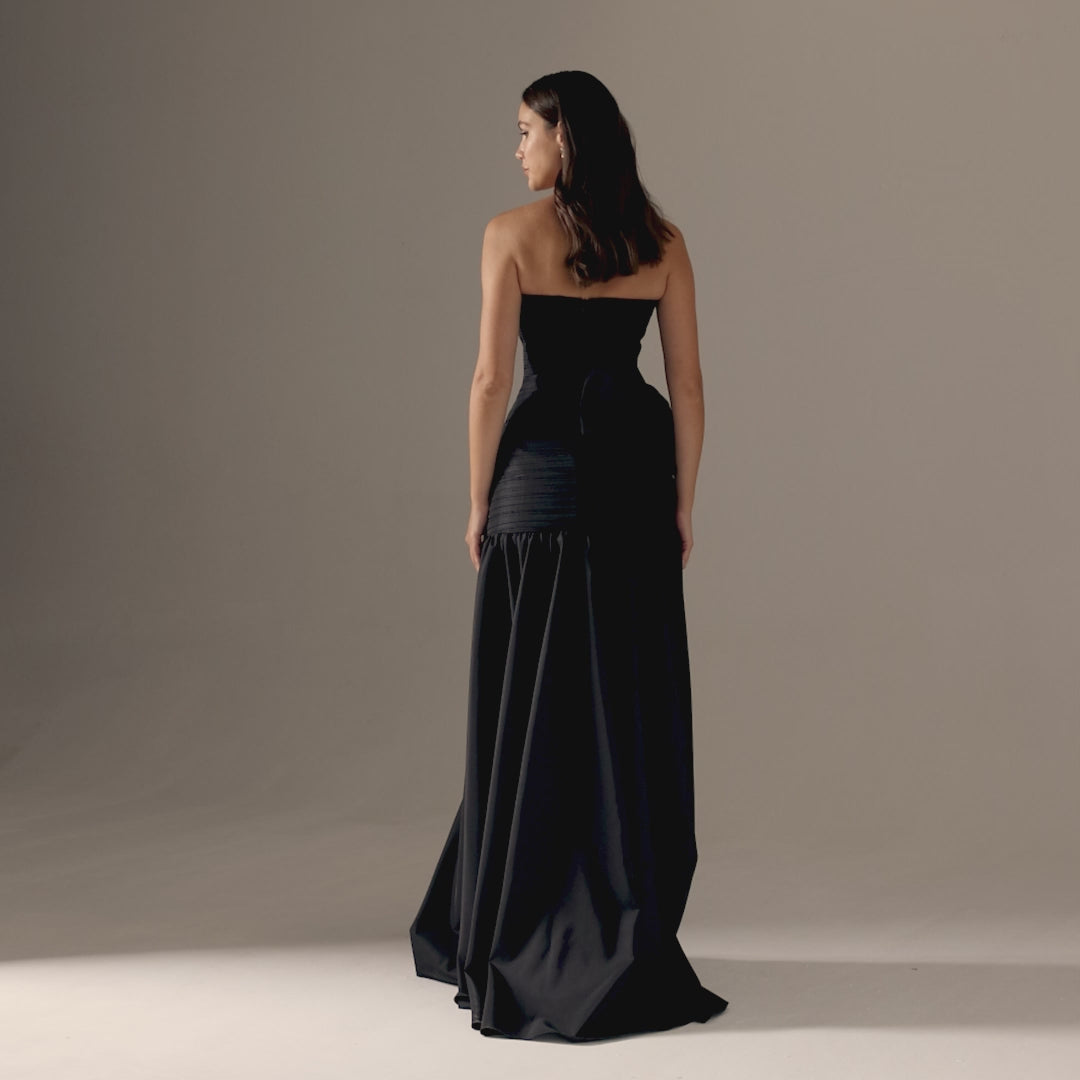 انغمسي في سحر هذا الفستان الطويل المصنوع من قماش التفتا والمكشكش. تصميمه الرائع أنيق ولافت للنظر، مما يجعلك مركز الاهتمام في أي مناسبة. سيجعلك القماش الفاخر والملاءمة الجذابة تشعر وكأنك أيقونة الموضة الحقيقية. ارتقي بأسلوبك مع هذا الفستان المذهل.