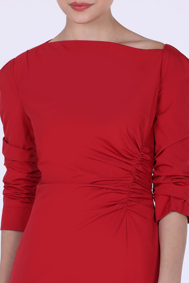 فستان ميدي بفتحة عنق غير متناسقة مع طيات
