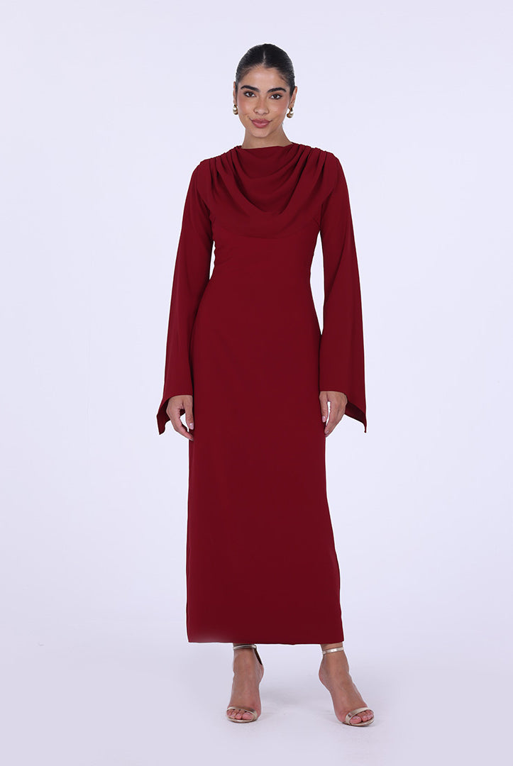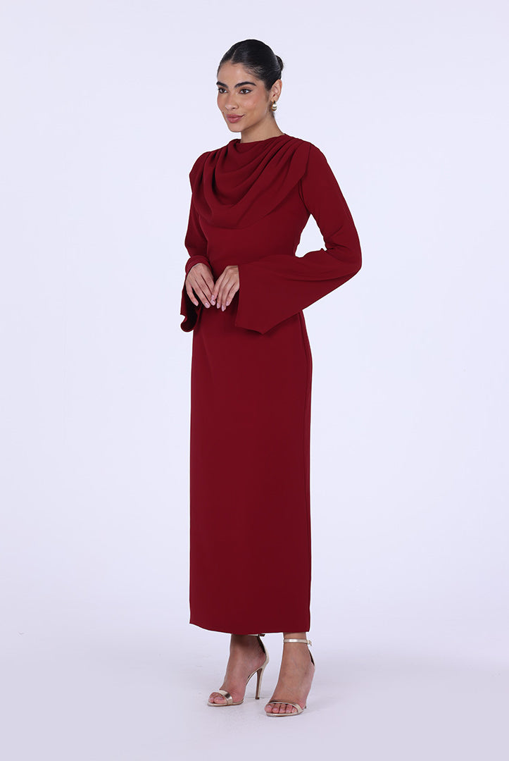 فستان أحمر ماكسي بياقة هالتر بتصميم درابيه
