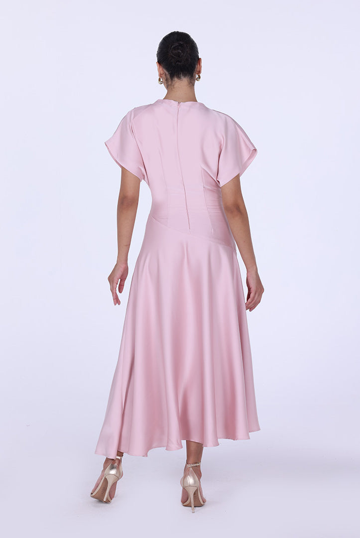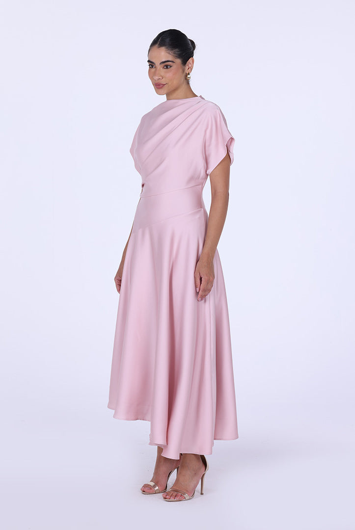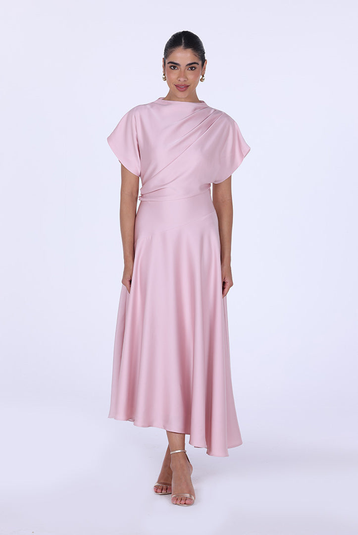 فستان ساتان غير متماثل بأكمام قصيرة