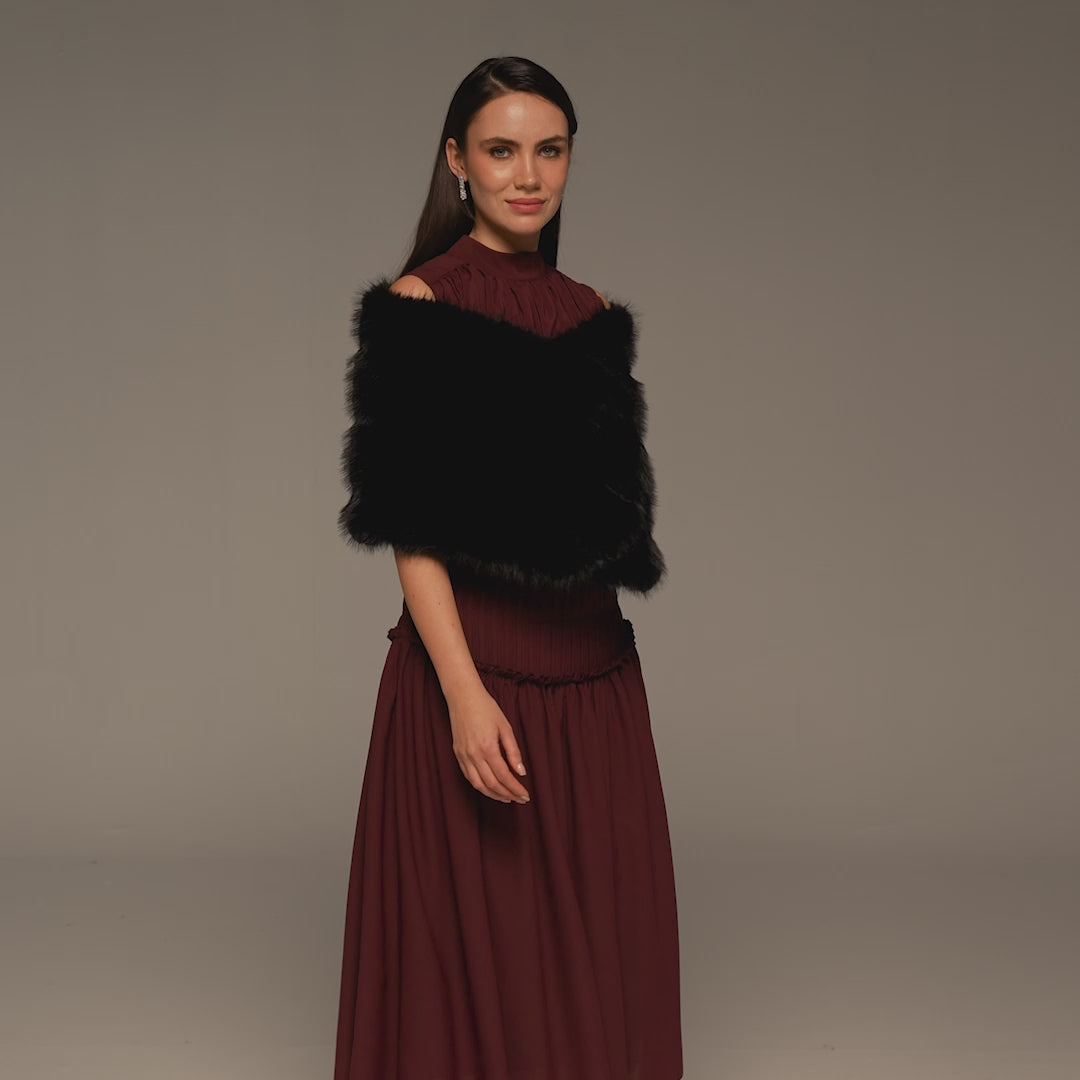 شال كتف من فرو السابل يضيف دفء، أناقة ونعومة لإطلالاتك المسائية. يتميز بملمس فخم وخفيف في الوقت نفسه، مما يجعله مناسباً للأجواء الباردة والمناسبات الخاصة. لونه الأسود يسهل تنسيقه مع مختلف الألوان والأقمشة ليمنحك مظهراً راقياً بدون مجهود.