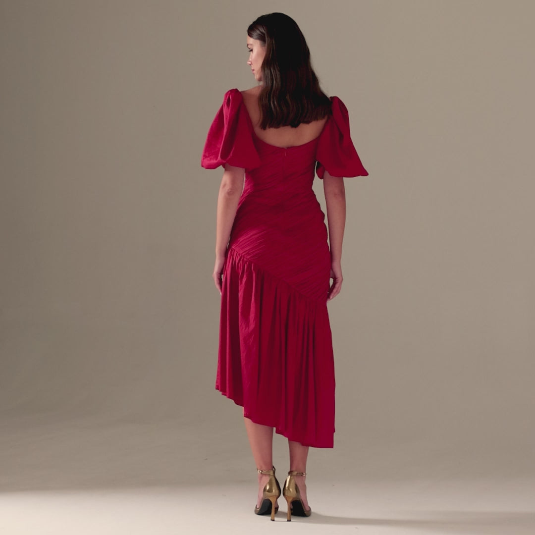 ارتقي بإطلالتك مع فستان ميدي بطيات وقصة غير متساوية. يتميز بتصميم أنيق وجذاب يناسب جميع المناسبات، ليمنحكِ إطلالة مميزة تلفت الأنظار.