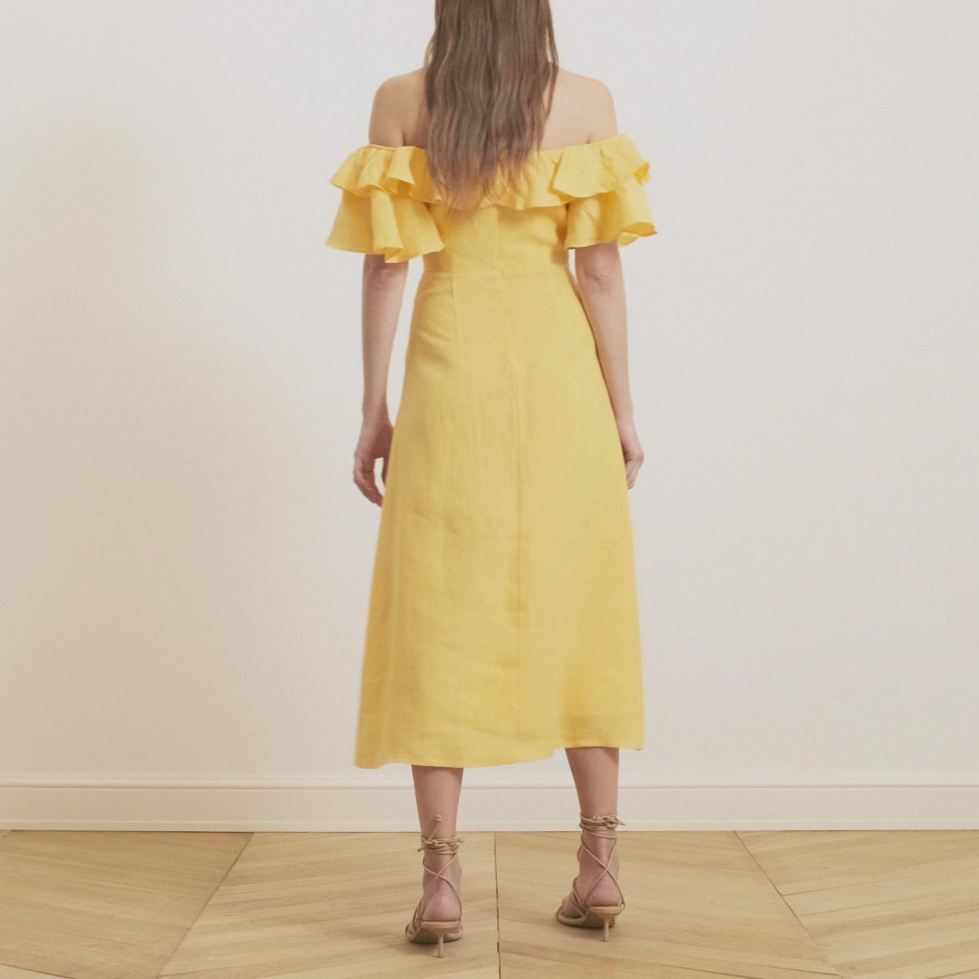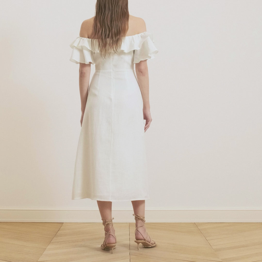 فستان كتان متوسط الطول مكشوف الكتفين