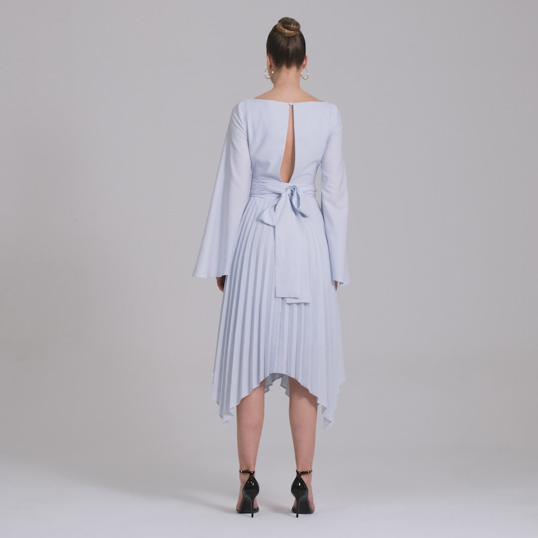 يتميز هذا الفستان بأناقة كلاسيكية فريدة من ياقته الجميلة وأكمامه الطويلة الواسعة عند المعصم إلى حزامه الذي يلتف حول الخصر ويربط في شكل ربطة كبيرة في الخلف، كما تمتاز تنورته بكسرات ضيقة عند الوسط تتسع تدريجياً حتى نهايته في قصة لا مثيل لها.