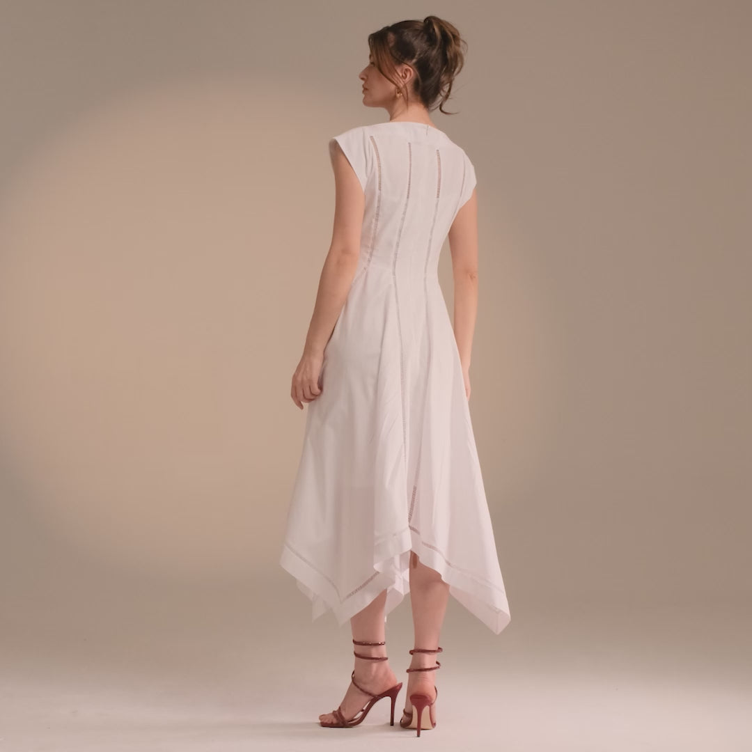 فستان ألينا المميز والمصنوع من قماش البوبلين الفاخر باللون الأبيض. تضيف القصة المربعة لمسة من الجاذبية، بينما يحافظ الطول المتوسط على مظهر أنيقًا. مثالي للسهرات أو المناسبات الخاصة، هذا الفستان يتألق بالأناقة والرقي.