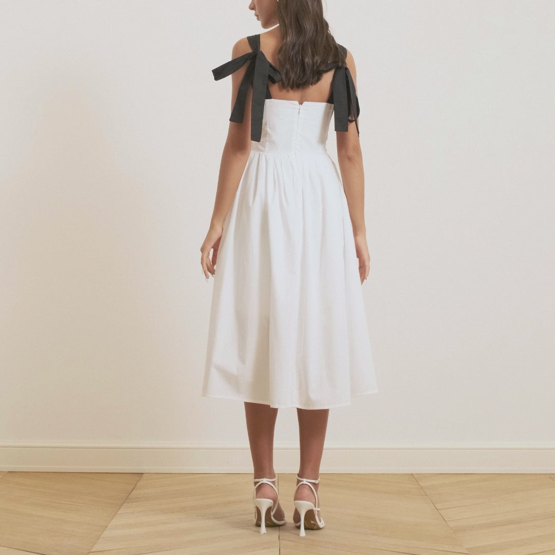 لا شيء أجمل من تباين الأبيض والأسود. يتميز هذا الفستان الكامي الأبيض بياقة مربعة وظهر مكشوف، ويأتي بحمالات سوداء عريضة تُربط في الخلف في شكل أنيق يزيد جماله. نسقيه مع صندل كعب أبيض أو أسود لتحقيق توازن الإطلالة.