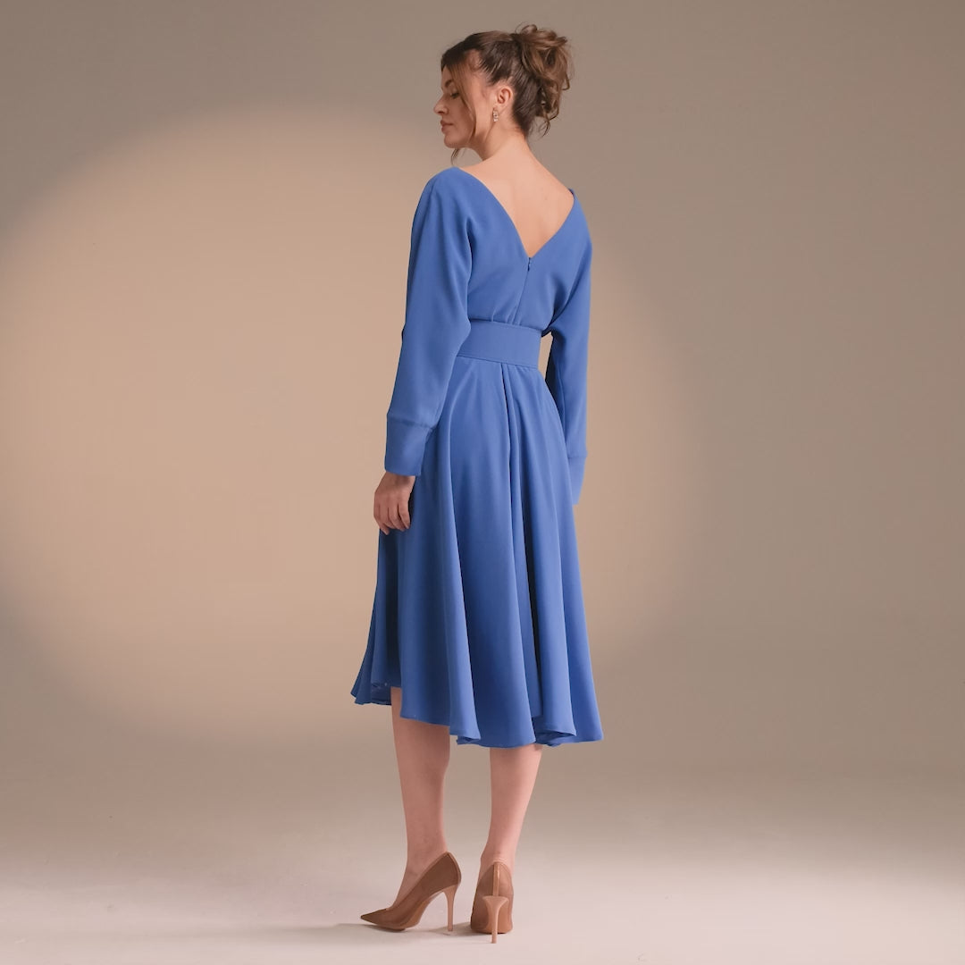 استمتعي برقي لا يُضاهى مع هذا الفستان الأنيق باللون الأزرق، الذي يجمع بين الأناقة الكلاسيكية ولمسة من الحداثة. تضيف الياقة على شكل V لمسة من النعومة والأنوثة، بينما تمنحكِ الأكمام الطويلة شعوراً بالثقة والأناقة. تصميمه الأنثوي وقصته المتوسطة تجعله مثاليًا للمناسبات الخاصة واليومية. لا تفوّتي فرصة اقتنائه لتكوني محط الأنظار.