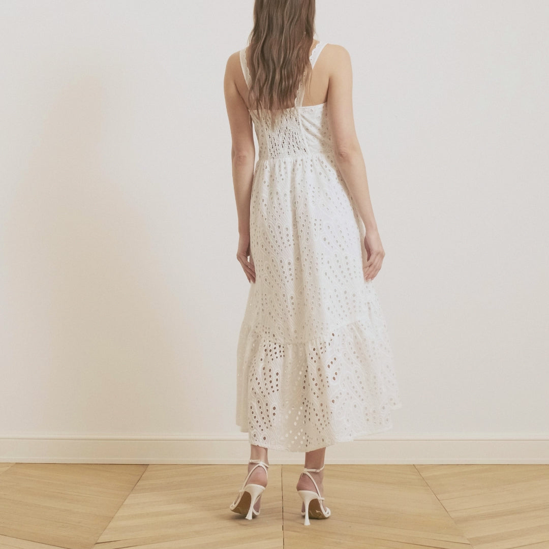 أضيفي هذا الفستان القطني الأبيض المريح إلى خزانتك الصيفية هذا الموسم! يمتاز الفستان بقصة عصرية أنثوية وهو مصنوع من قماش مطرز بالتطريز السويسري ببطانة حتى الركبة لتبرز جمال التطريز في الجزء السفلي للفستان.