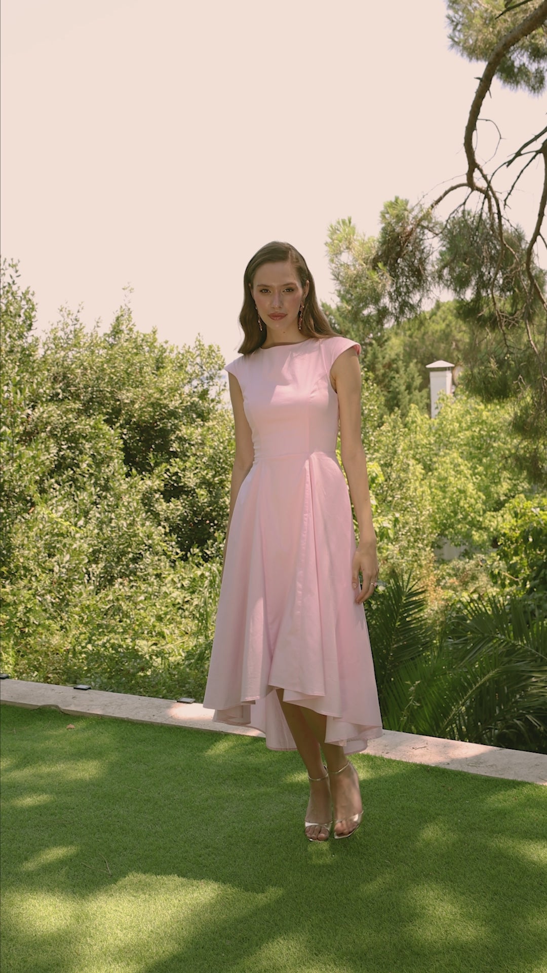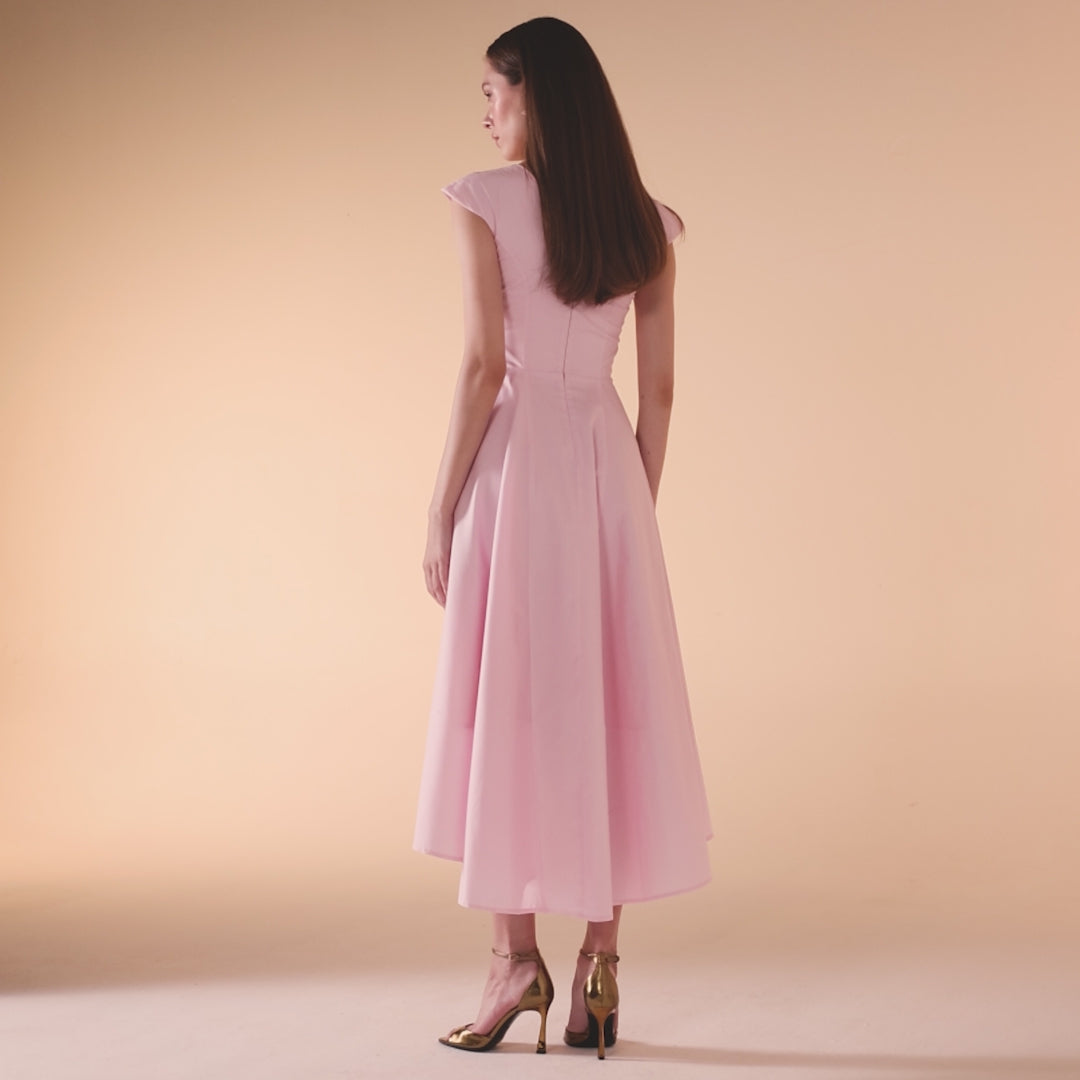 استمتعي بالفخامة مع فستان بوبلين متوسط ​​الطول بأكمام قصيرة. تخلق الأكمام الأنيقة والطول المتوسط ​​صورة ظلية متطورة، بينما يضيف اللون الوردي الناعم لمسة أنثوية. هذا الفستان مصنوع من قماش البوبلين عالي الجودة، وهو قطعة لا غنى عنها في خزانة ملابسك العصرية.