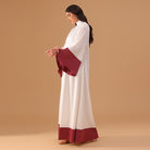 فستان ماكسي كريب بأكمام طويلة وحافة ساتان واسعة تمنح انسيابية وأناقة للتصميم. تضيف الياقة العالية لمسة عصرية، بينما تضيف الحواف متباينة اللون تحديداً ناعماً للتصميم. توفر القصة الواسعة الراحة وسهولة الحركة، ما يجعله خياراً عملياً للمناسبات المسائية أو اللقاءات الرسمية.