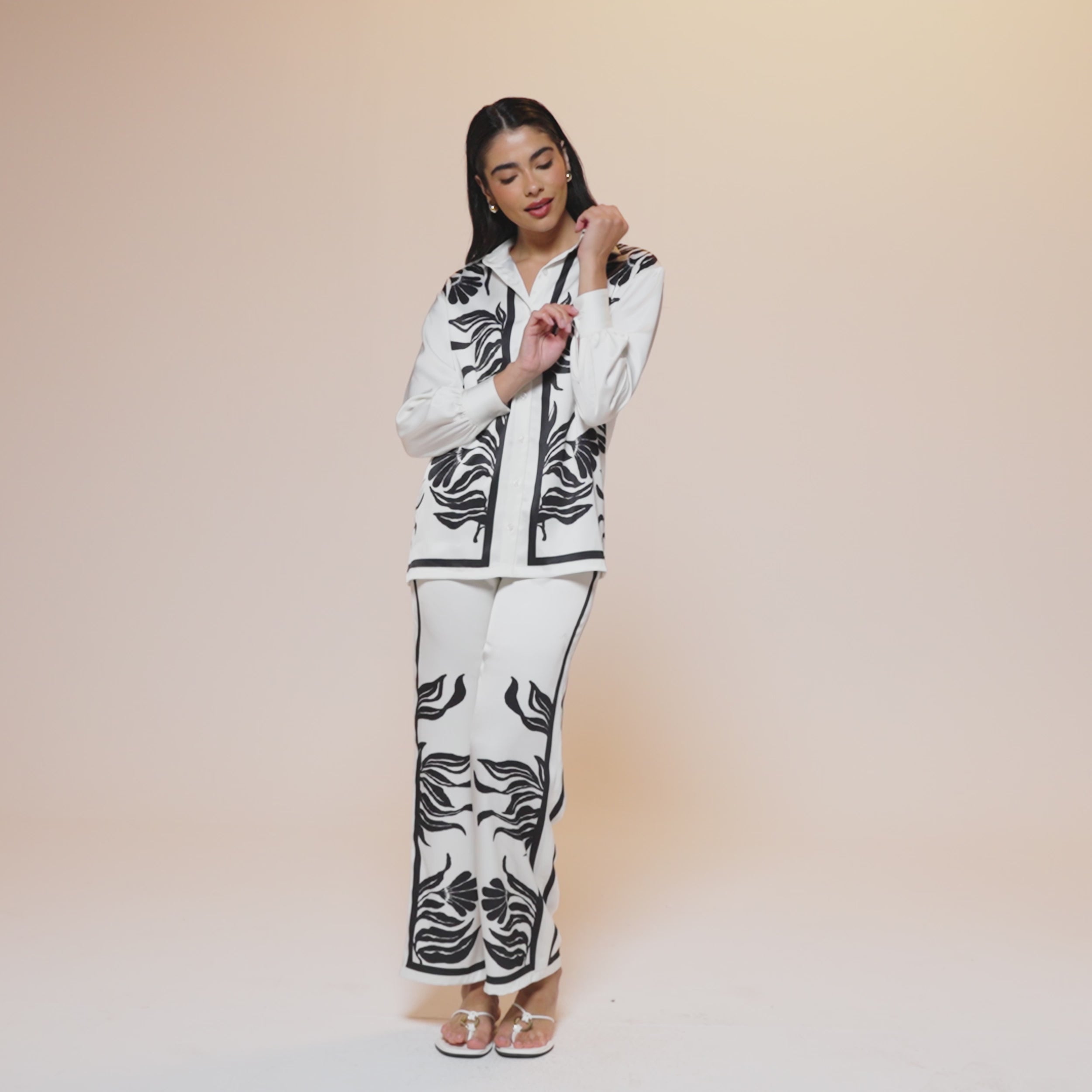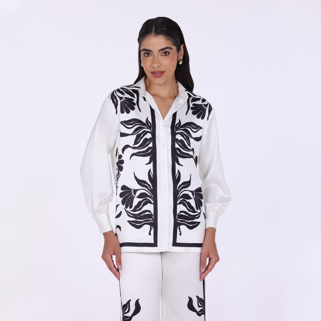 قميص طبعات بأكمام طويلة من مجموعة صيف 2025. يتميز هذا القميص المصنوع من الساتان الناعم بقصة منسدلة وكتف منخفض، وأكمام طويلة بأساور، ويأتي بأزرار أمامية تجعله تصميم يومي أنيق ومريح.