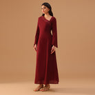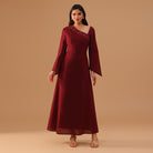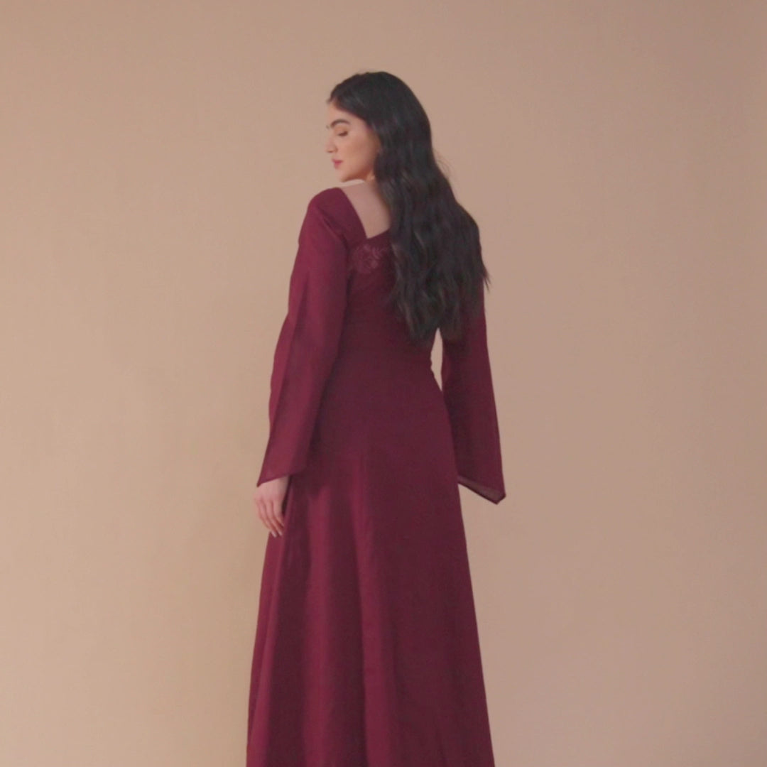 فستان برغندي مطرز بكتف مكشوف من قماش رامي