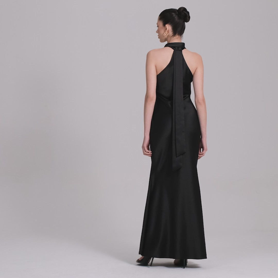 فستان أسود ستان طويل برباط متقاطع حول الرقبة