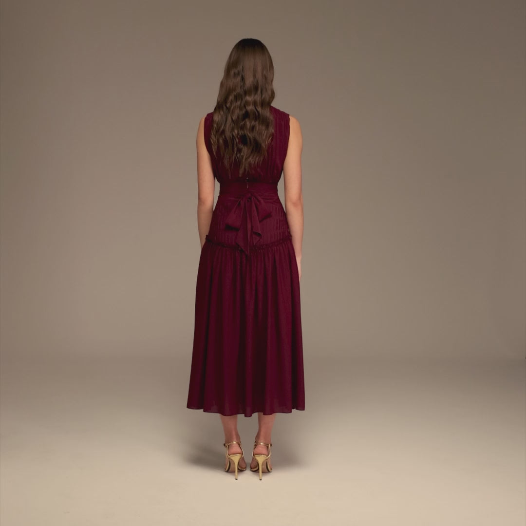 فستان ميدي شيفون مع تنورة واسعة وطيات رقيقة على الصدر. تضيف الياقة العالية لمسة راقية، بينما يحدد الخصر مع الربطة الخلفية القوام بأسلوب مريح. يمنحه تصميمه بدون أكمام خفة مناسبة للأجواء الدافئة والمناسبات شبه الرسمية.