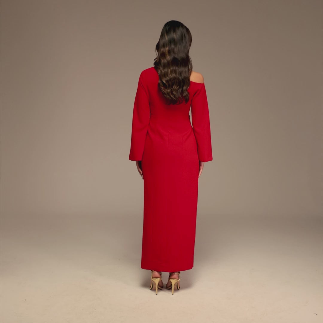 فستان أحمر ماكسي كريب بكتف مكشوف