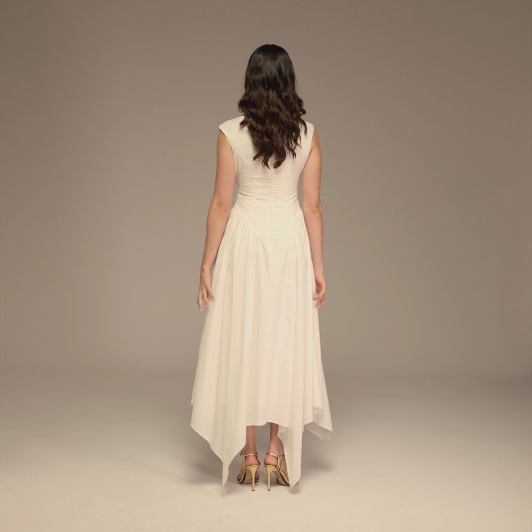 فستان ميدي بدون أكمام من قماش البوبلين، يتميز بخصر مزموم بثنيات أفقية تضيف تحديد بسيط يجمّل الجسم. تأتي الياقة المستقيمة والحافة غير المتماثلة لتعطي التصميم طابعًا أنيقًا ومعاصرًا، ليكون سهل التنسيق في مختلف المناسبات.