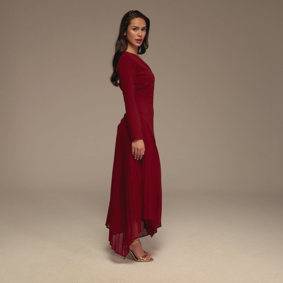 فستان بكتف واحد بتصميم متباين الخامة، يأتي بتوب كريب وتنورة شيفون بليسيه تضيف خفة في الحركة. تمنح الياقة والحافة غير المتماثلتين الفستان طابعًا عصريًا وملائمًا للمناسبات الراقية.