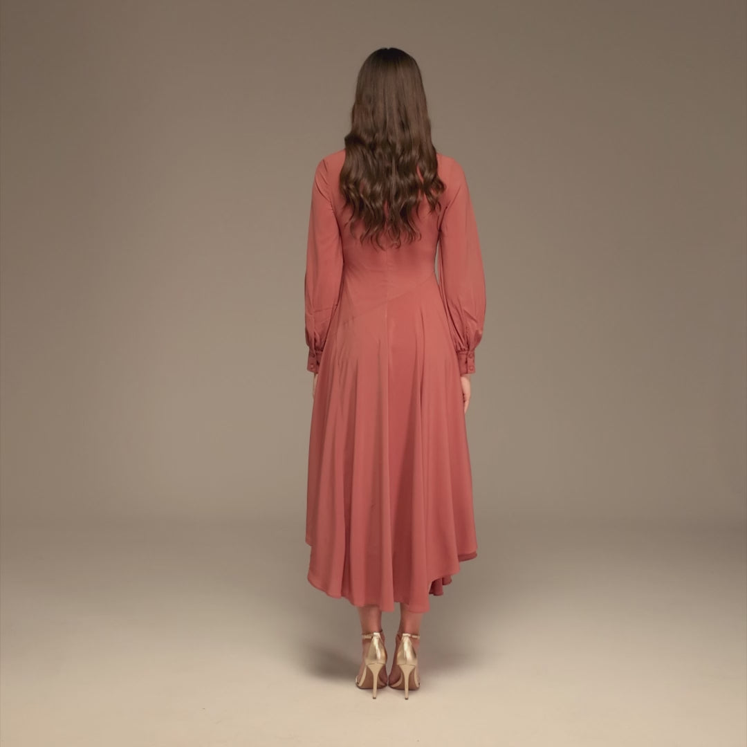 فستان شيفون ميدي بياقة مستديرة وأكمام بف يضفي حضوراً أنثوياً بانسيابية رقيقة. يتميز بياقة عالية مستديرة، وأكمام بف تنتهي بأساور بأزرار، بينما تضيف الحاشية غير المتماثلة حركة خفيفة إلى الإطلالة.