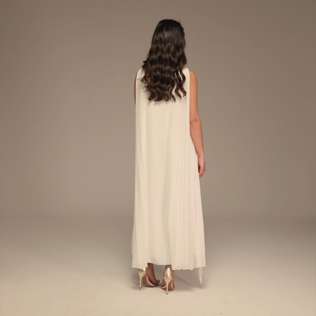 فستان ماكسي بدون أكمام مصنوع من كريب خفيف، يتميز بياقة مستديرة كلاسيكية وكيب بليسيه ينسدل من الكتفين كأجنحة ناعمة. تنسدل القصة بانسيابية دون أن تفقد الخصر تحديده، لتمنحك حضورًا راقيًا دون مجهود.