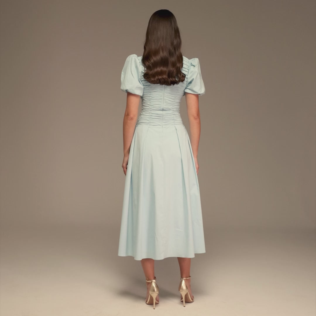 فستان ميدي بأكمام قصيرة وثنيات على الصدر يتميز بتصميم متوازن يجمع بين الكلاسيكة والعصرية. تأتي منطقة الصدر بثنيات ناعمة تبرز التفاصيل، مع أكمام بف قصيرة تنتهي بأساور بأزرار، بينما تنسدل التنورة بقصة A تمنحك إطلالة أنثوية أنيقة ومريحة.