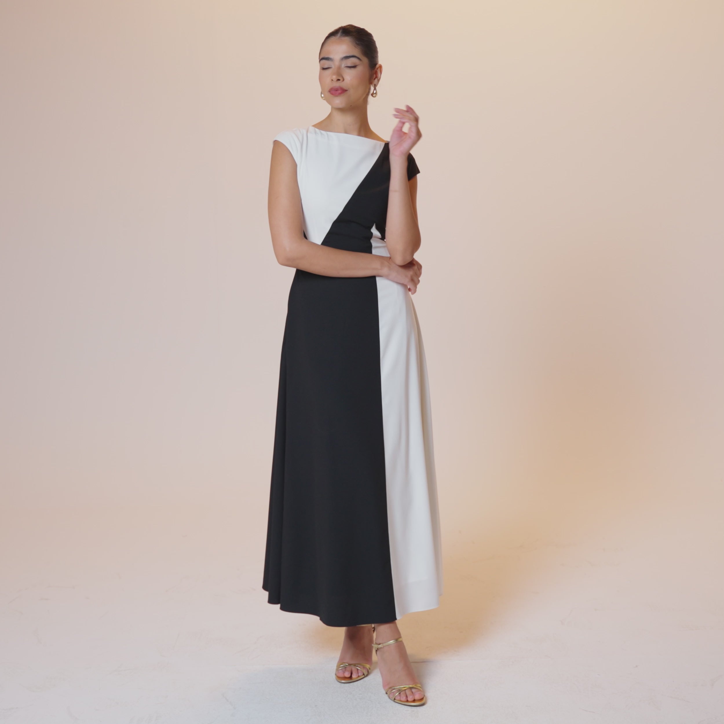 فستان ميدي بلونين متباينين من مجموعة صيف الينا 2025. يجمع هذا الفستان، المصنوع من كريب ناعم بلوني الأبيض والأسود، بين التباين الجريء والقصة الانسيابية لإطلالة أنيقة بلا مجهود.