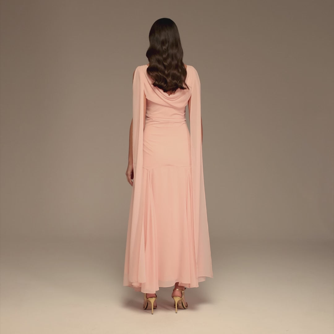 فستان ماكسي شيفون بدون أكمام ينبض بأنوثة حالمة. يأتي بتطريز أزهار ناعمة وتنورة واسعة بطيات انسيابية. تضيف الياقة الدرابيه نعومة على التصميم، بينما يزين الظهر المنخفض وشاحان ينسابان من كل كتف بحركة أنثوية راقية. وتكتمل الإطلالة بتنورة منسدلة تضيف لمسة ساحرة لكل خطوة.