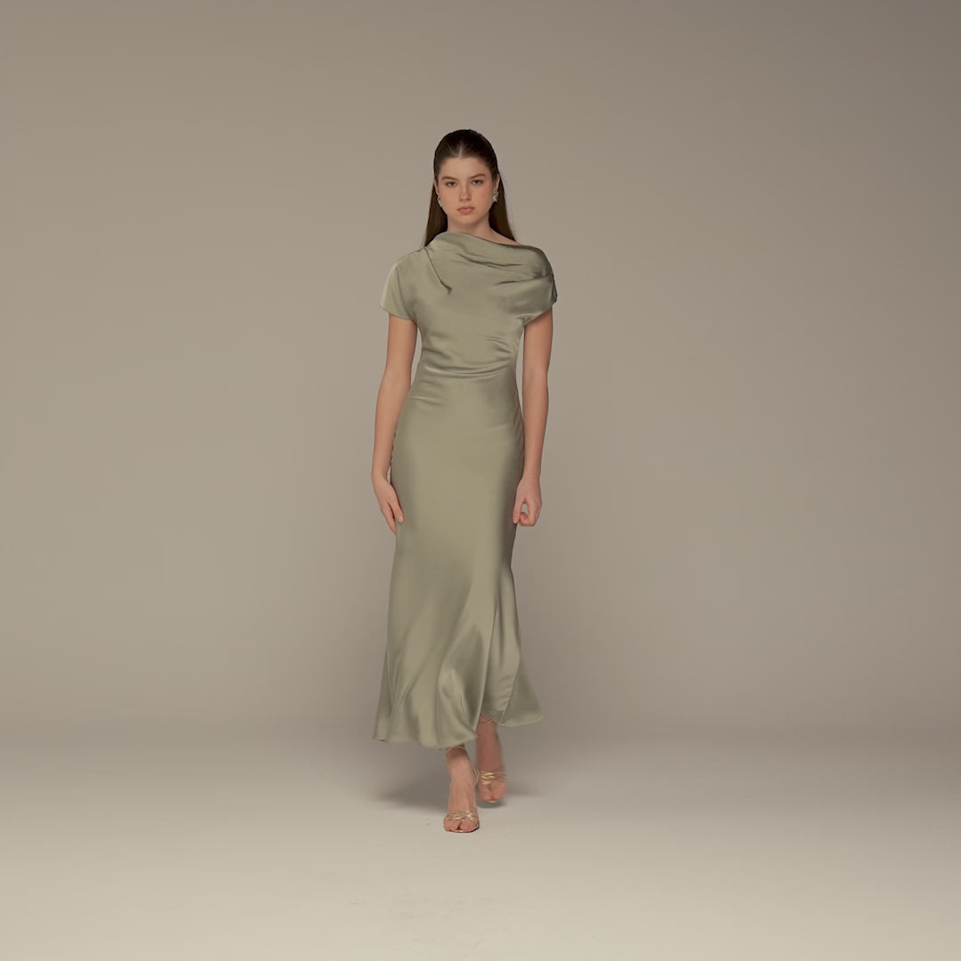 فستان ماكسي من الساتان بياقة درابيه ناعمة تضيف لمسة انسيابية جميلة للتصميم. ينسدل قماش الساتان بسلاسة على الجسم ليمنح مظهر أنيق مع إحساس مريح أثناء الارتداء، ما يجعله خيار ملائم لمناسبات العيد عندما ترغبين بإطلالة مرتبة بتفاصيل هادئة.