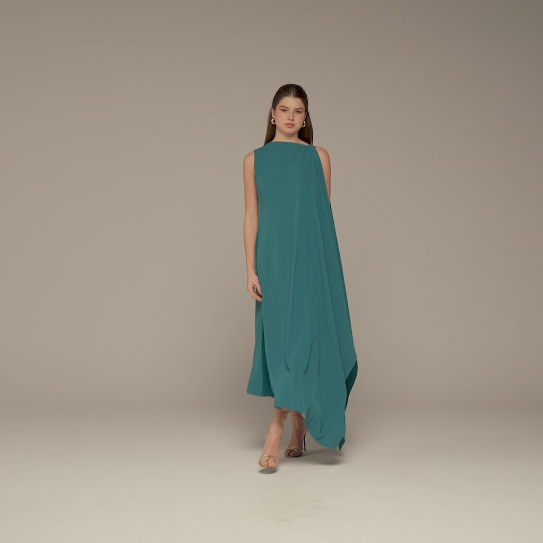 فستان تركواز ماكسي كريب بدون أكمام مع سكارف
