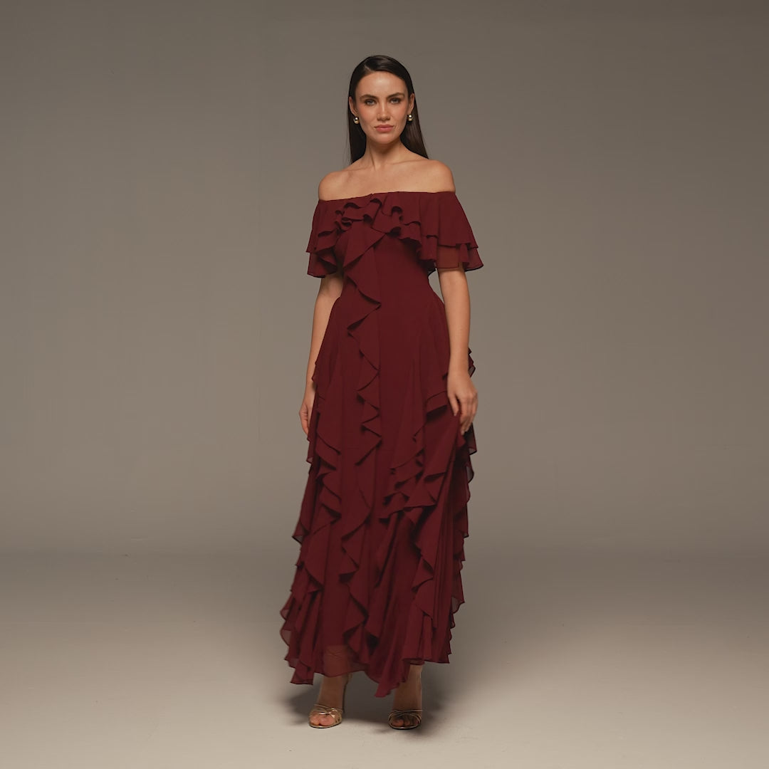 يأتي هذا الفستان بياقة مكشوفة مع أكمام مكشكشة تبرز منطقة الكتفين، بينما تمنح القصات الناعمة عند الخصر تحديداً مريحاً دون تقييد. تضيف الكشكات المنسدلة على طول التصميم حركة عصرية وانسيابية، ويجعله طوله الماكسي خياراً مناسباً للأعراس والخطوبات والسهرات المسائية.