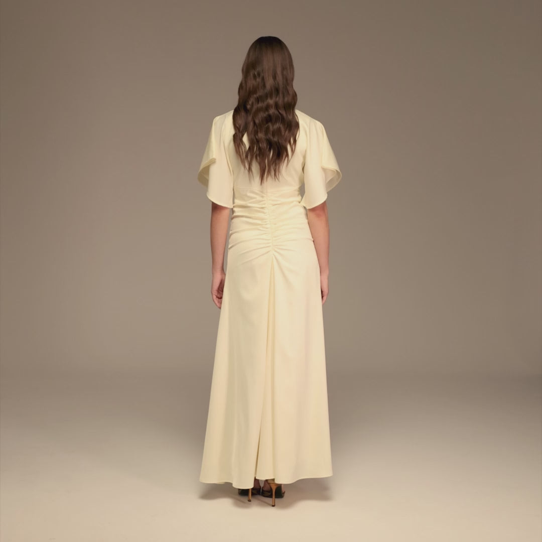 فستان ماكسي ساتان بتفاصيل مجعدة عند الخصر تمنح القوام تحديدًا جميلًا من دون تقييد. يأتي الفستان بأكمام تشبه أجنحة الفراشة، مع ياقة دائرية تضيف توازناً ناعماً للتصميم، في حين تنسدل التنورة بقصة A مع نهاية واسعة تمنح حركة انسيابية.