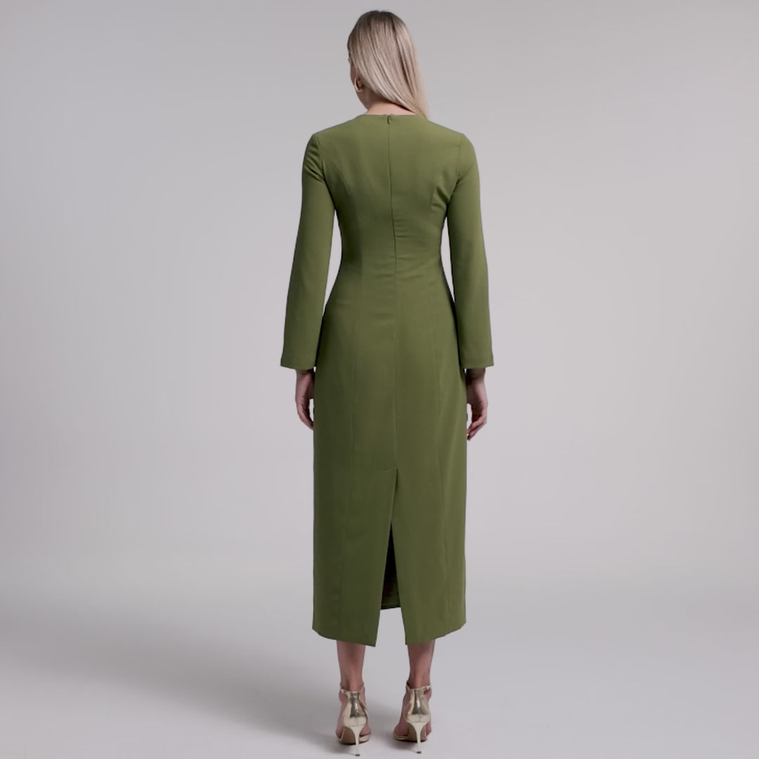 فستان ماكسي كريب باللون الأخضر الزيتي يجمع بين تصميم ضيق عن الصدر والخصر وقصة مستقيمة تمنح القوام طولًا وانسيابية. تتميز الرقبة غير المتماثلة مع فتحة صغيرة عند الصدر بلمسة عصرية، بينما توفر الأكمام الطويلة بحافة واسعة تغطية أنيقة تناسب الأمسيات والمناسبات الرسمية.