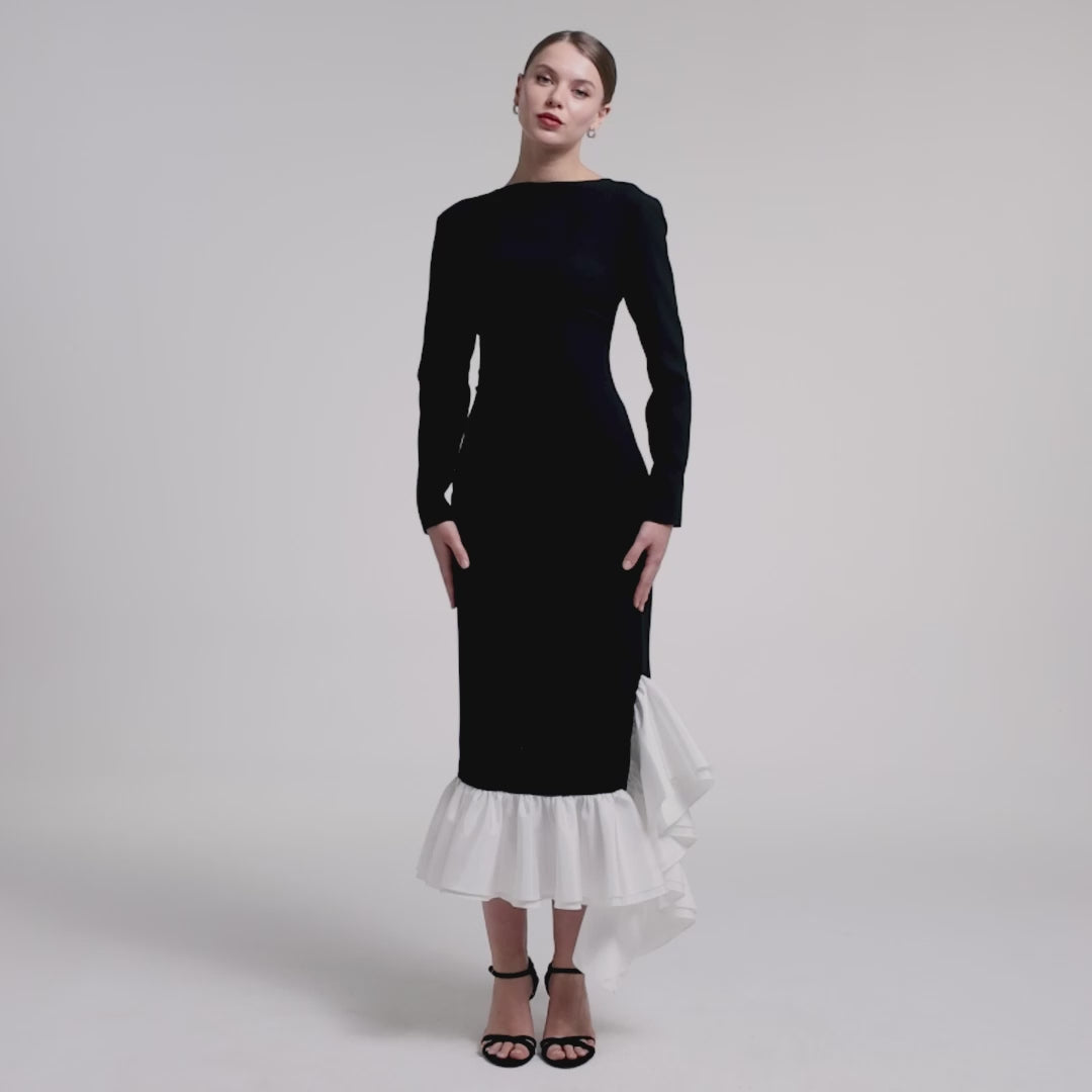 استمتعي بتألق الألوان المتناقضة مع فستان ميدي أسود من الكريب الفاخر. تصميمه الانسيابي يبرز أنوثتكِ، بينما يضفي الكشكش الأبيض عند نهاية التنورة لمسة من الرقي والجاذبية. ويمنحكِ نسيج الكريب الناعم الراحة والأناقة طوال الوقت، ما يجعله مثاليًا لإطلالة ساحرة في المناسبات الخاصة.