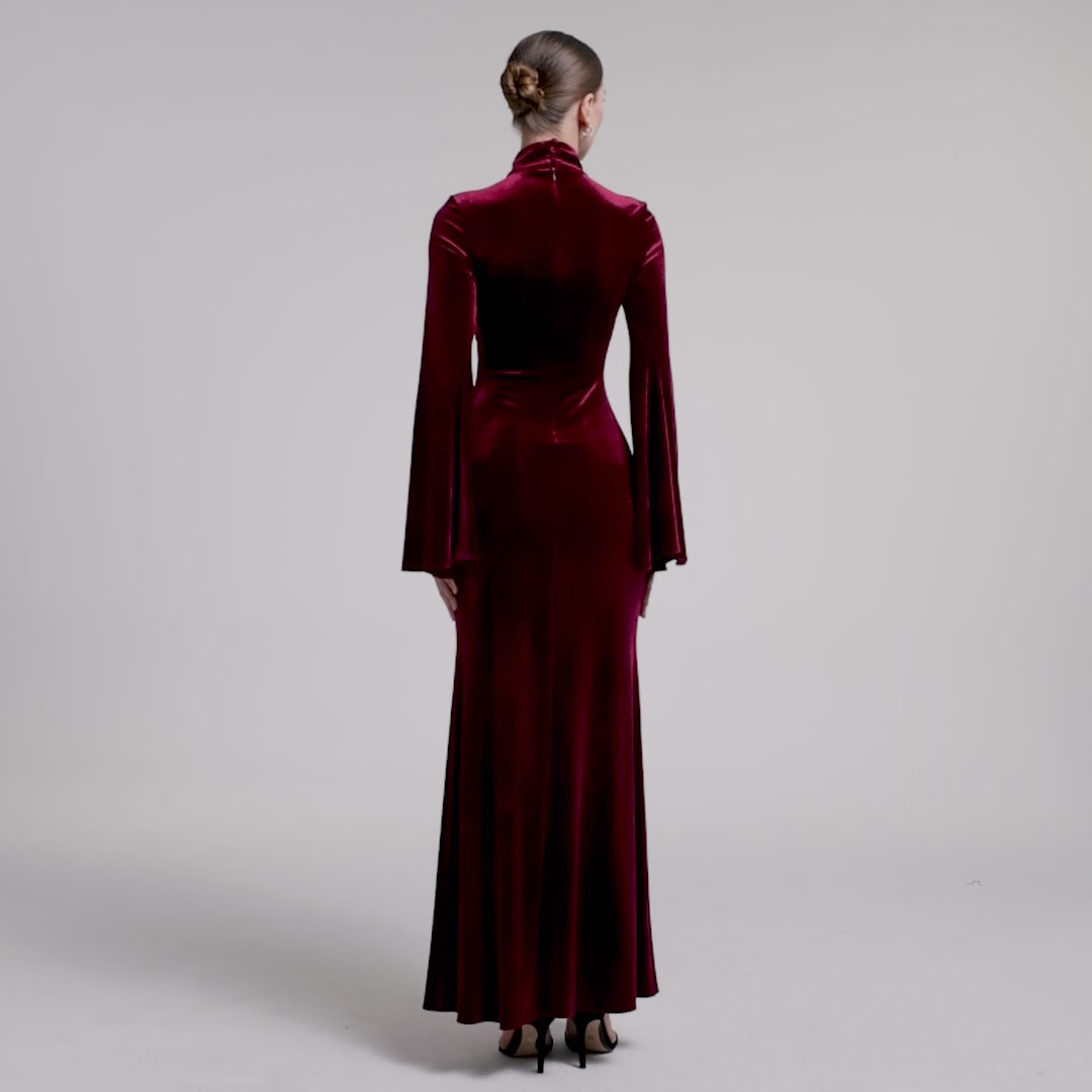 فستان برغندي مخمل بياقة عالية وأكمام واسعة