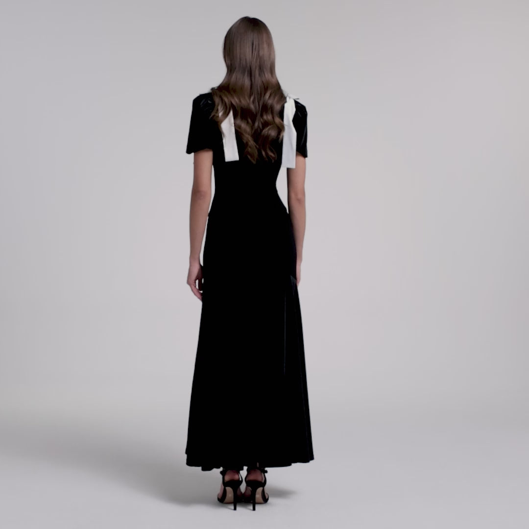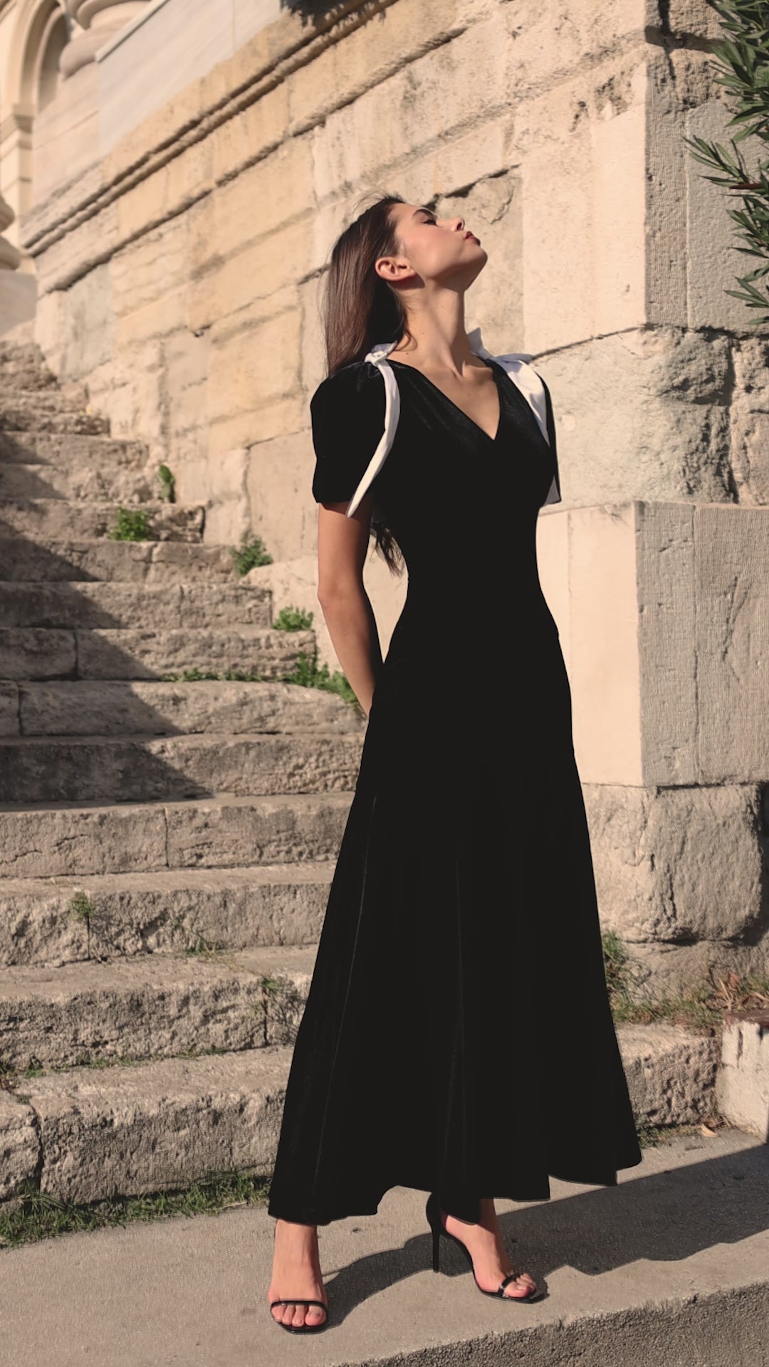 تألقي بإطلالة راقية مع هذه القطعة الكلاسيكية التي صُممت خصيصًا للمرأة العصرية التي تقدر الأناقة الكلاسيكية. صنع هذا الفستان من المخمل الأسود الناعم بياقة على شكل قلب تضفي جمالًا ورقيًا على منطقة الصدر. تضيف الأكمام المنتفخة القصيرة مع الربطات لمسة من السحر الكلاسيكي، ويتسع الفستان رويدًا رويدًا ليكوّن تصميمًا واسعًا يُطيل القوام. يجمع الفستان بين الفخامة والرومانسية بأسلوب ساحر ما يجعله مثاليًا للمناسبات المسائية والحفلات الرسمية.