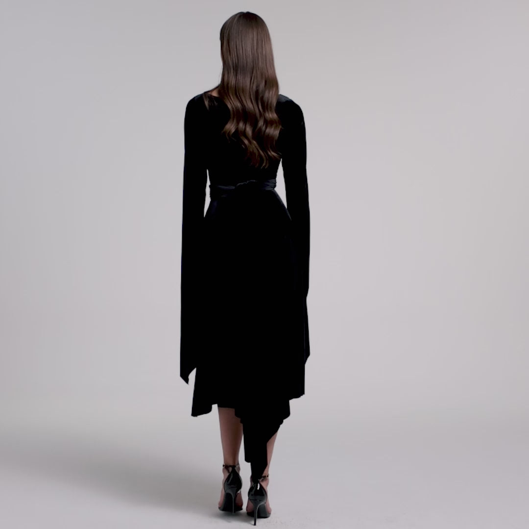 فستان ماكسي مخمل بتفاصيل توازن بين الأناقة والراحة. يأتي بحزام ملتف من نفس القماش يمكن فتحه وإغلاقه من الخلف، ما يسمح بتعديل بسيط للقياس. تنسدل الأكمام الطويلة الواسعة بحركة أنثوية، بينما تمنح الحاشية غير المتساوية انسيابية ناعمة عند الحركة.